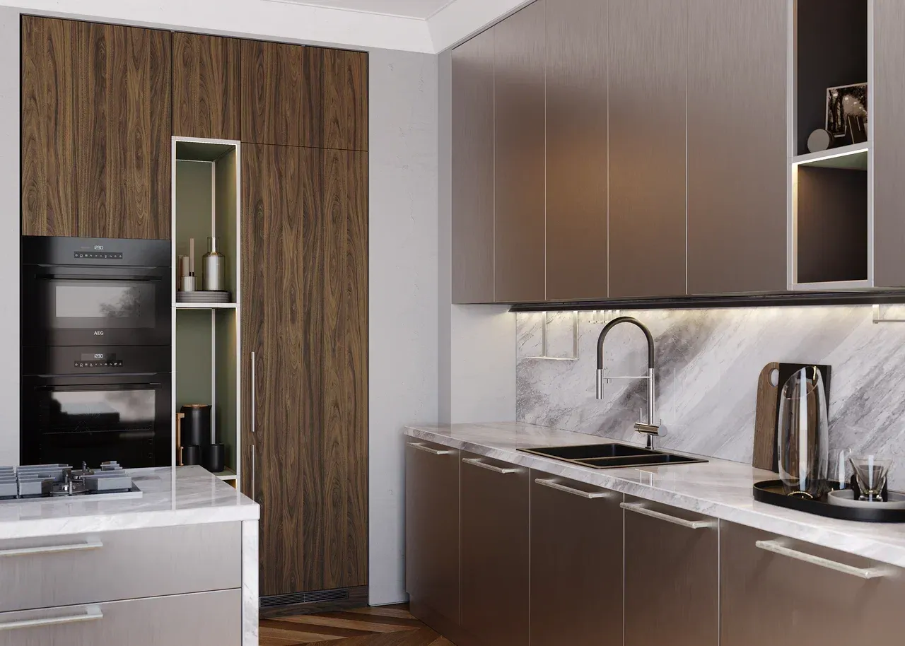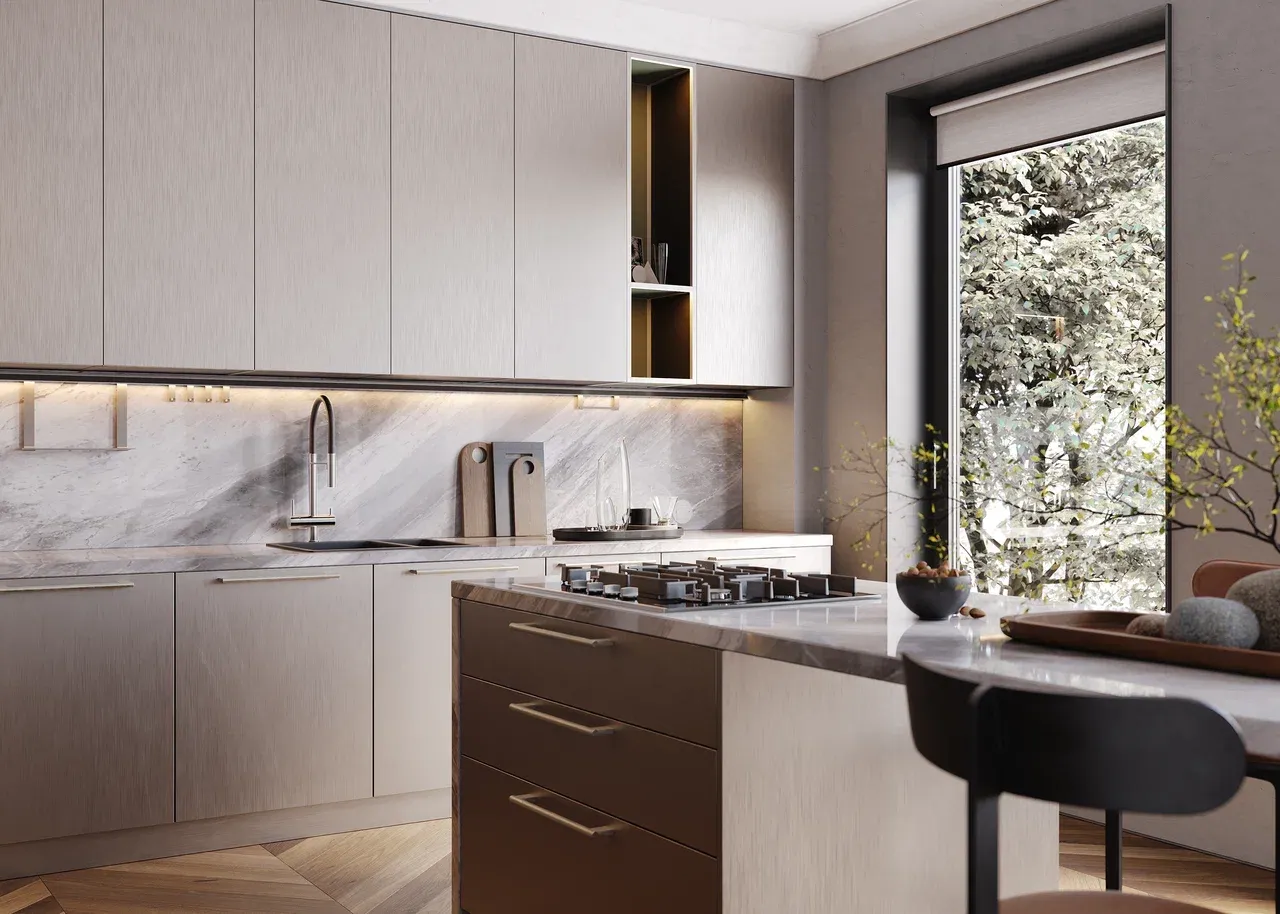 Кухня модерн с островом с интегрированными рабочими поверхностями и ящиками для хранения обеспечивает максимальную практичность.
