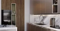 Корпус изготовлен из долговечного ЛДСП в двух изящных цветах: GH графит и Агава GV. Декор фасада вашей кухни включает фасады из панелей Витра 3p, покрытые пленкой AGT Пикассо Бронза GPB. На колонках установлены фасады Витра 3p, также покрытые пленкой AGT MNS.