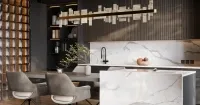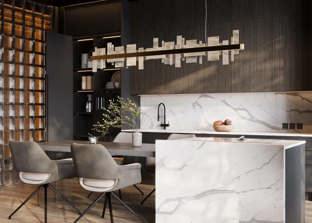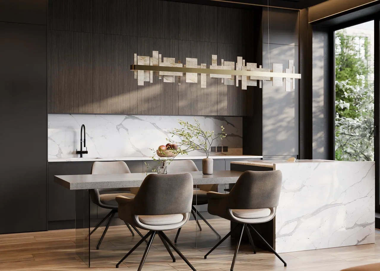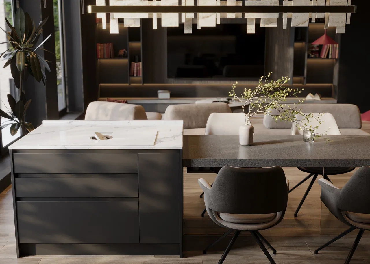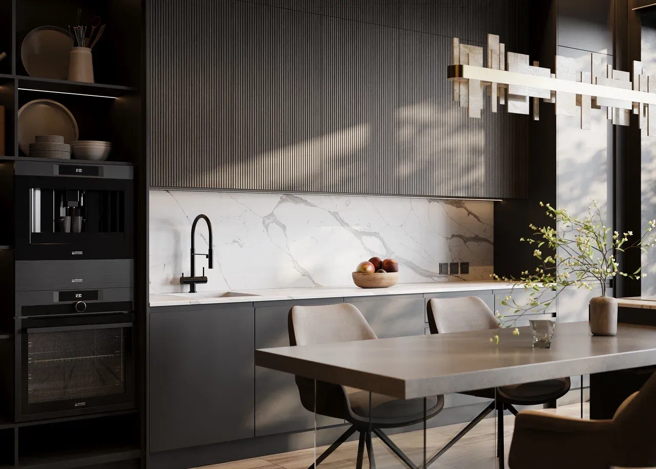 Темные оттенки придают кухне элегантность и современность, делая ее центром внимания в интерьере.