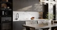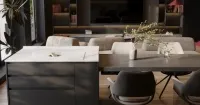 AVANT QUARTZ, обеденная зона: акриловый камень Teomar 60мм N 539 Earl Grey2 материал столешниц, декор “A7070 Калакатта Версаль”.
