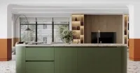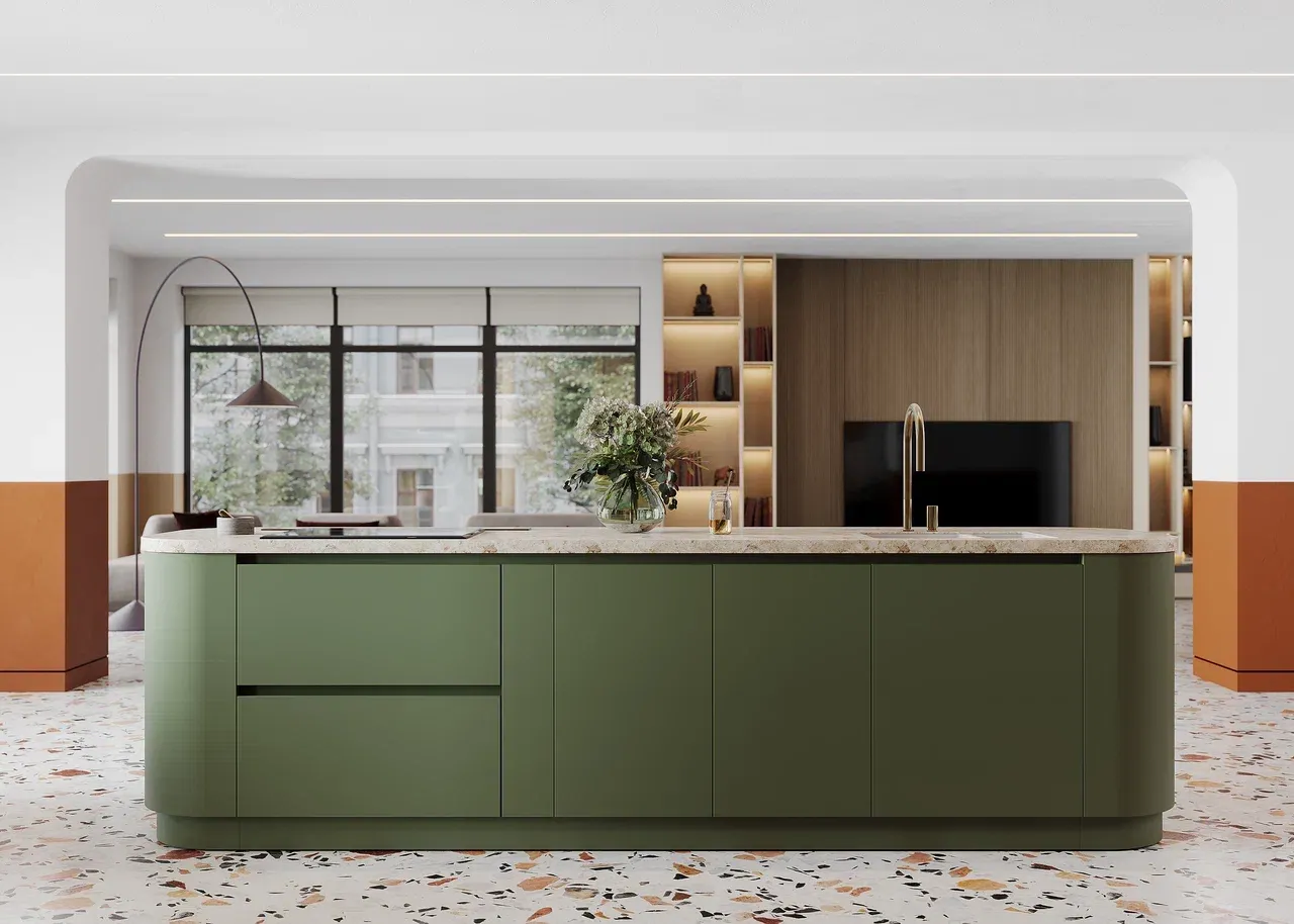 Остров имеет 4 свободные стороны, что позволяет оборудовать дополнительную зону хранения с ящиками, использовать его как рабочую поверхность или место для завтрака.