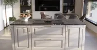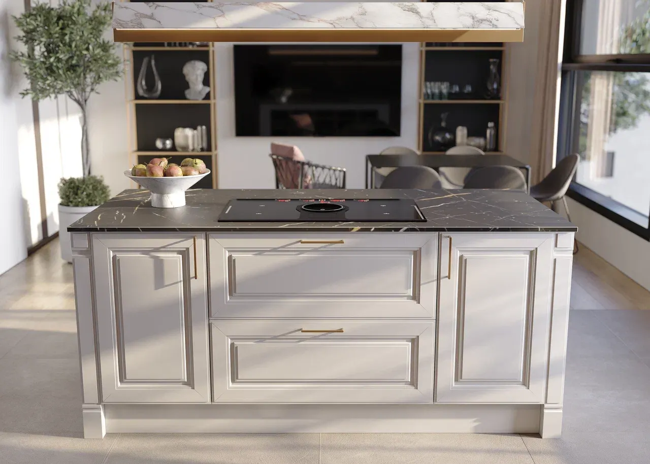 • Столешницы выполнены из керамики Ceralan, а их декор — 1497 Изабелла Лигурия.