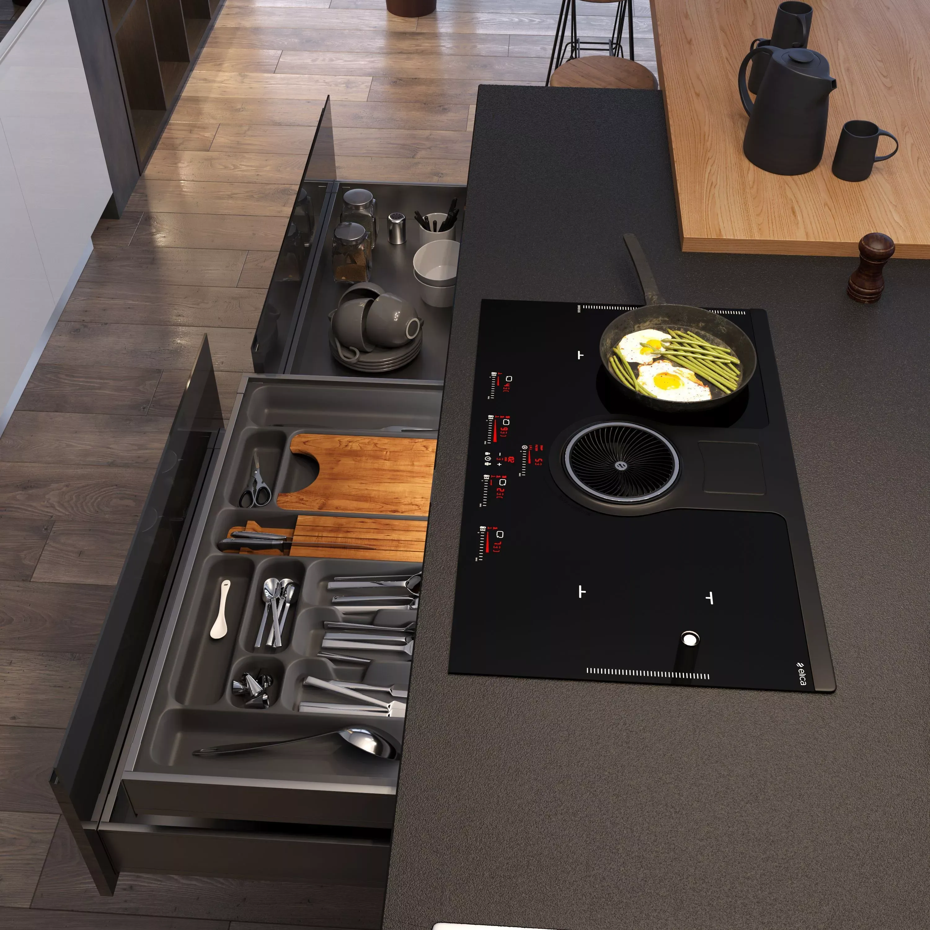 • остров с варочной поверхностью и отделениями для хранения;