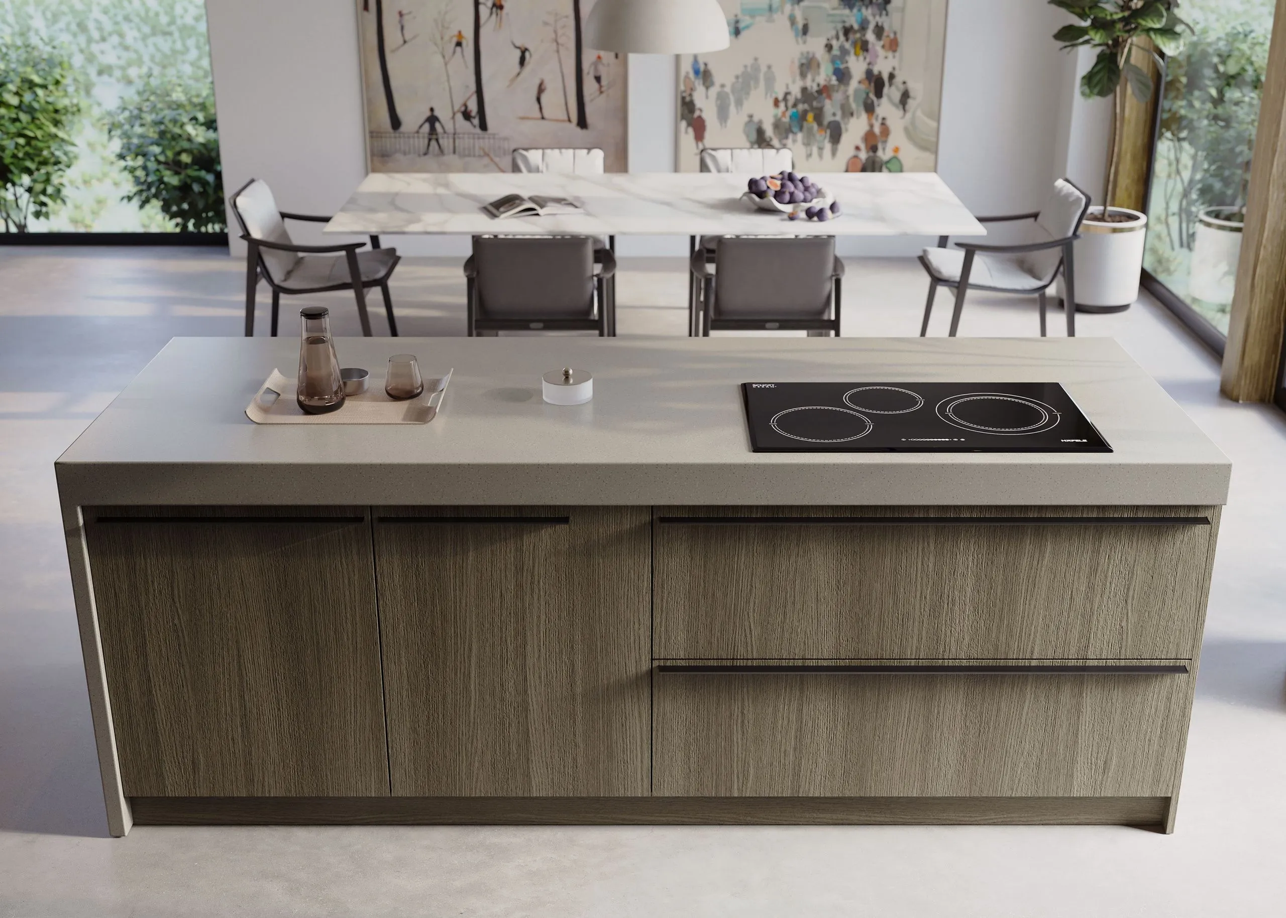 Данная кухня спланирована с наличием острова, который не только служит дополнительным рабочим пространством, но и создает комфортную зону для общения и приема пищи.