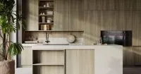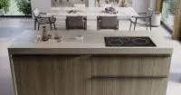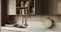 Столешница из акрилового камня Grandex отличается высокой прочностью и эстетикой. Она выполнена в сдержанном декоре Urban Project (A425). Удобные ручки-профиль Гамма обеспечивают легкий доступ к содержимому шкафов.