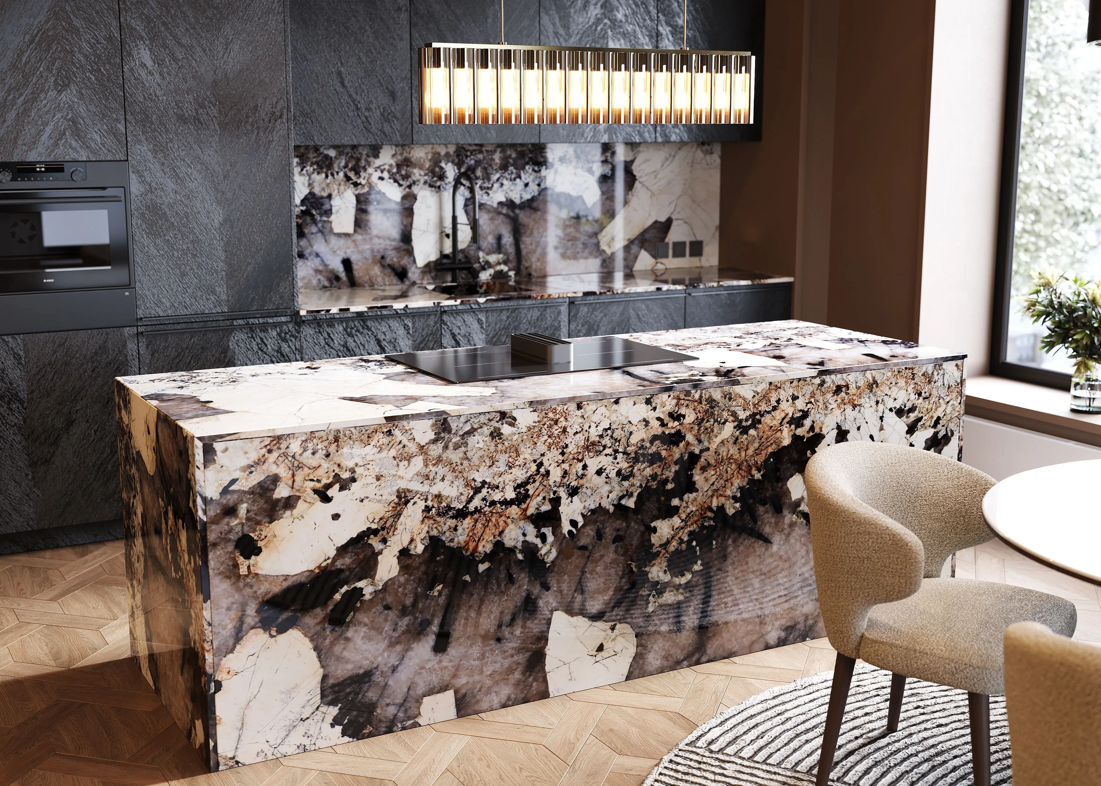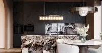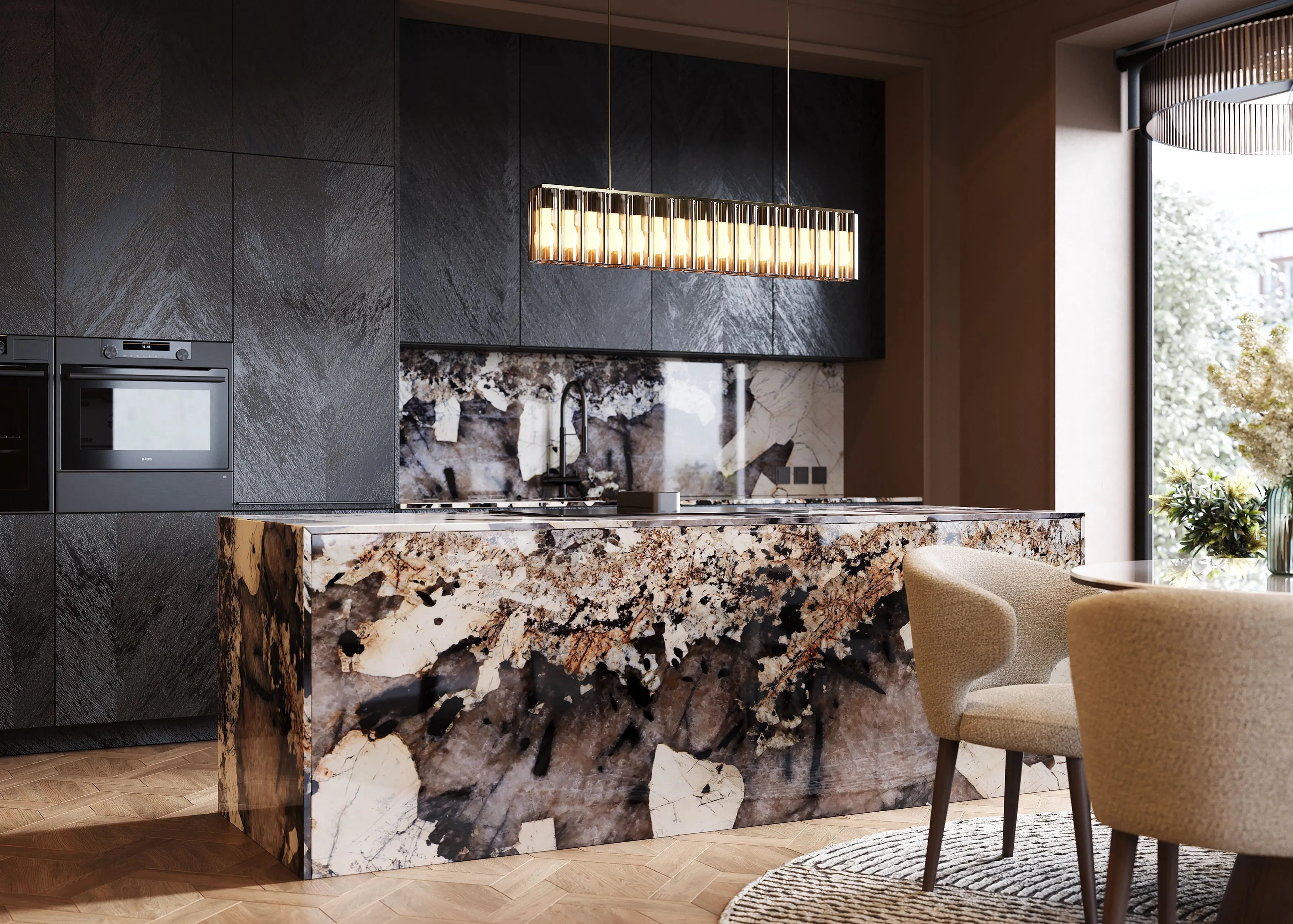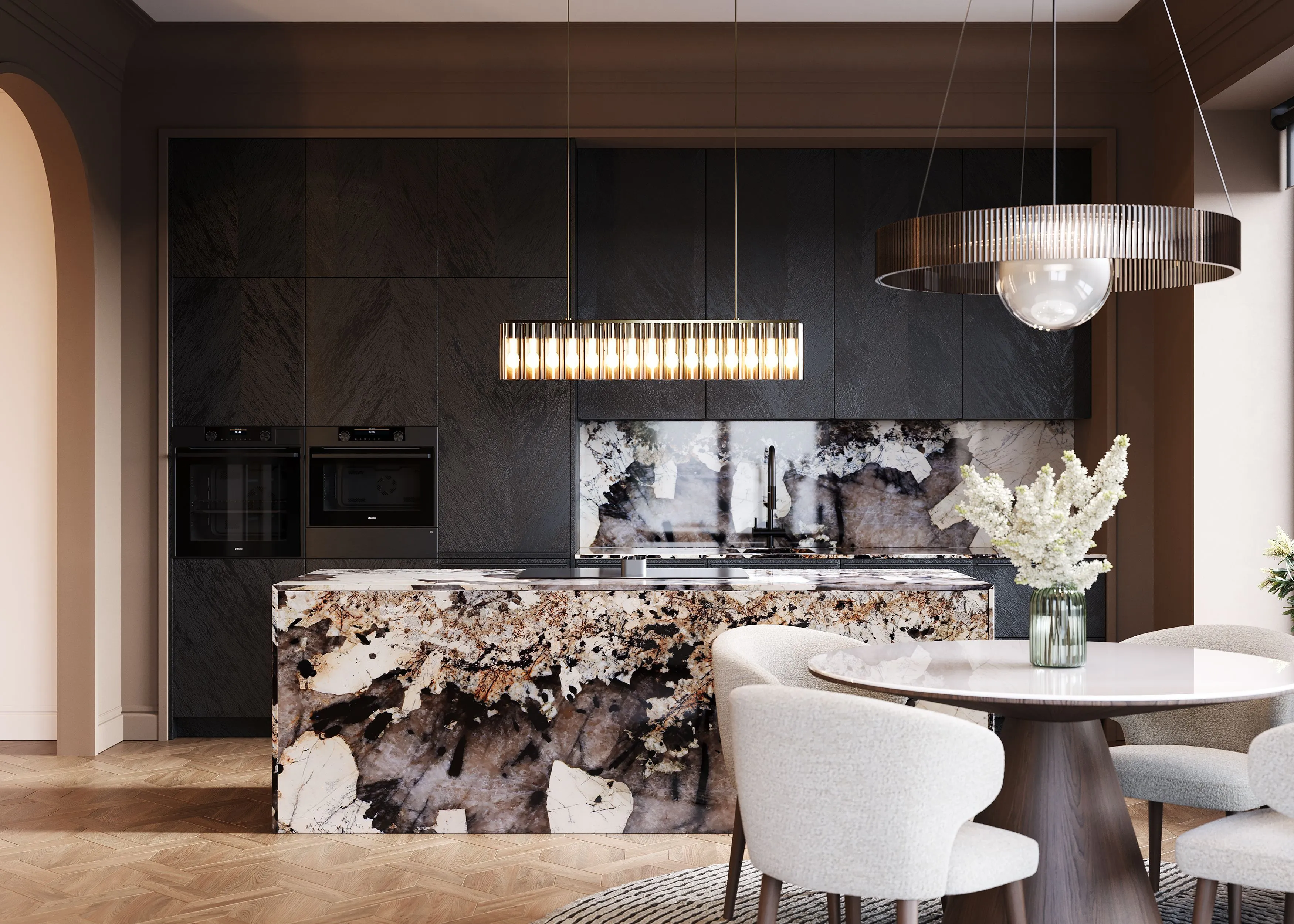 Кухня в стиле эклектика с островом и столешницей из натурального камня — благородные линии, изысканная фактура и безупречная функциональность. Тонкое сочетание традиции и современного комфорта.