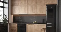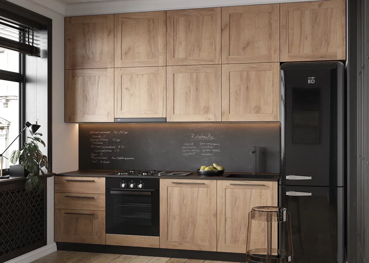 Кухня в светлых тонах с фасадами под массив в стиле кантри идеально подходит для небольшой студии или кухни-гостиной. Компактная, с продуманной лаконичной конструкцией, она смотрится аккуратно и современно. Матовое покрытие практично, поскольку на нем не видны незначительные загрязнения. Кроме того, за матовой поверхностью проще ухаживать. Черные ручки удобны и выглядят стильно.