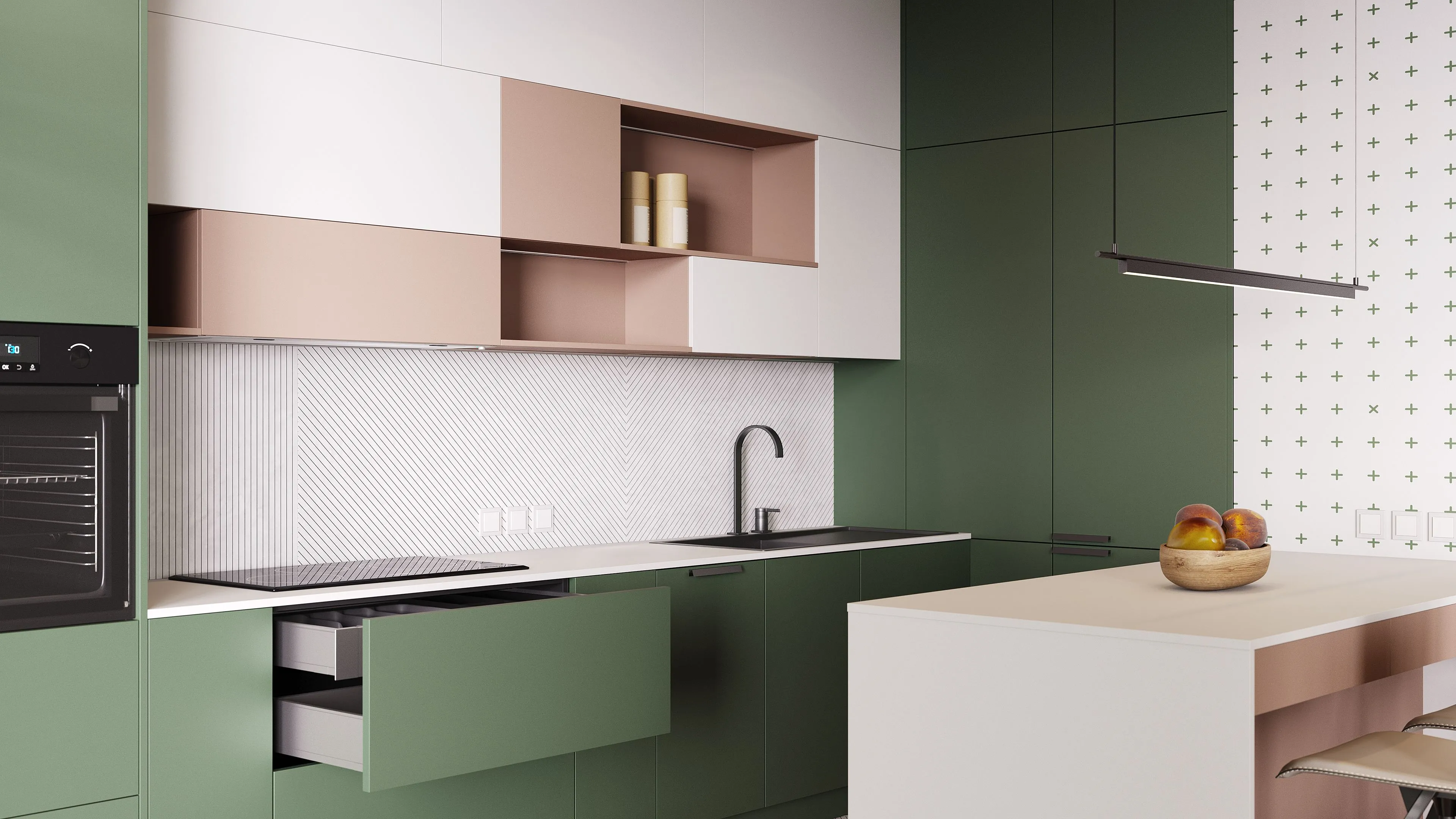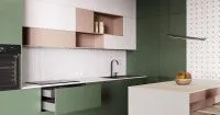 Компактная кухня с островом в светлых тонах — это удобный и приятный в использовании гарнитур, благодаря которому у вас всегда будут под рукой все принадлежности для готовки. Оригинальная дизайнерская модель отлично впишется в современный интерьер, например, в квартиру, оформленную в стиле минимализм или сканди. Сочетание белого цвета, сдержанных зеленых тонов и песочно-розовых создает одновременно впечатление живости, активности и не слишком привлекает взгляд. Мы изготавливаем кухни на заказ, поэтому вы можете при покупке изменить цвет фасадов, а можете оставить вариант «по умолчанию». Гарнитур изготавливается по индивидуальным размерам.