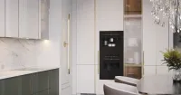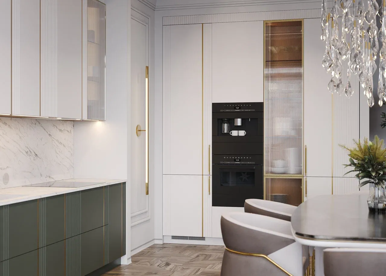 Корпус изготовлен из долговечного ЛДСП в цвете Белый Премиум. Фасады из МДФ в эмали с частичной фрезеровкой и металлической вставкой из латуни создают элегантный вид. Нижние фасады выполнены в эмали RAL6011, что добавляет глубины и насыщенности цвету. Рама для Futur с декором в золоте придает фасадам изысканный вид, идеально вписываясь в современные и классические интерьеры.