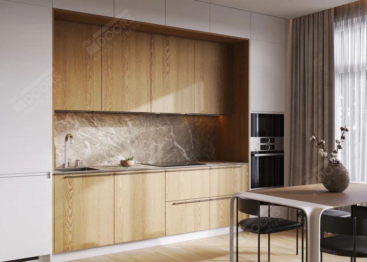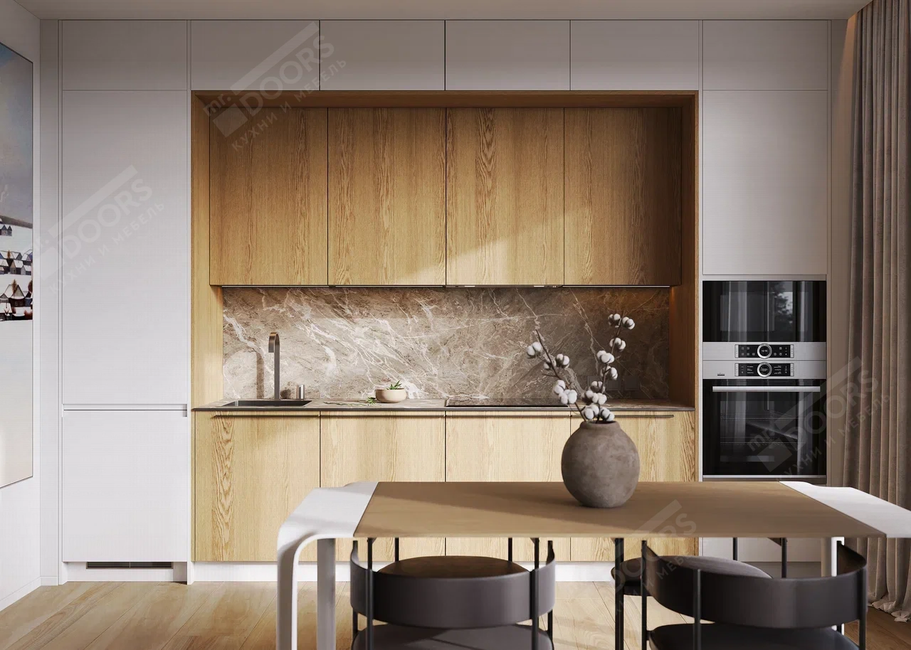 | Материал и декор фасада: | МДФ в шпоне и интегра в белой эмали 126T2 Дуб |