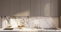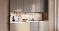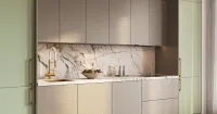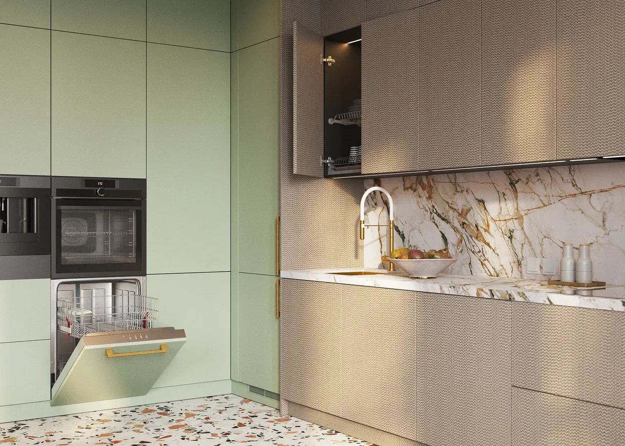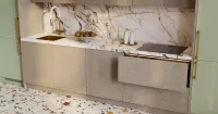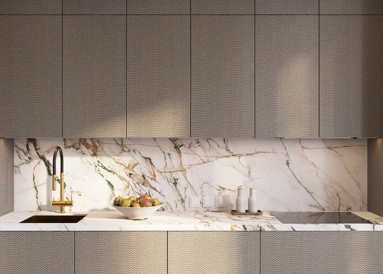 Материал столешницы — керамика Ceralan толщиной 40 мм с декором “1828 Тончелли оро”. Эта столешница отличается высокой прочностью и устойчивостью к повреждениям, а её элегантный декор придает кухне современный и стильный вид.