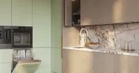 Корпус изготовлен из долговечного ЛДСП в изысканном цвете Гейнсборо GJ. Декор фасада МДФ в матовой эмали палитра NCS (зеленые), МДФ в шпоне 131D Твил. Это подчеркивает утонченность дизайна и стиль вашего интерьера.