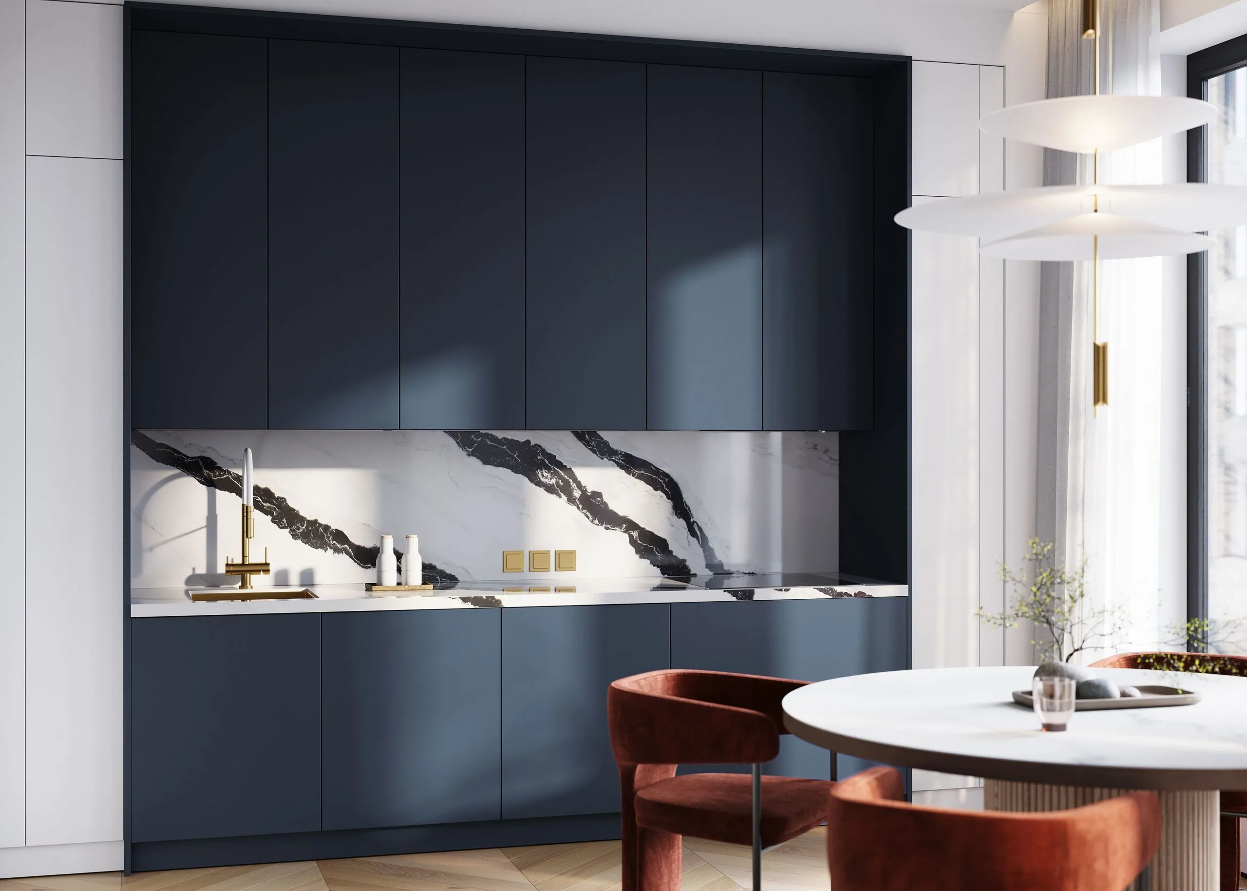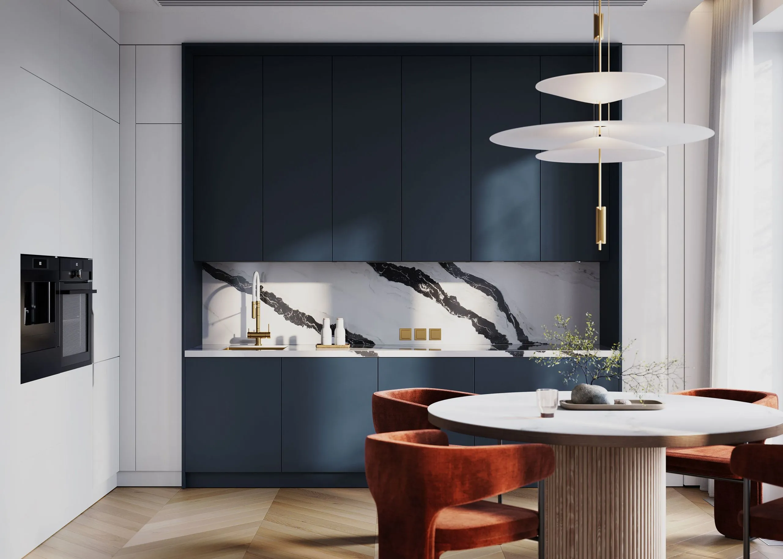 Эта кухня сочетает неожиданные текстуры и оттенки, объединяя современные тренды с индивидуальным характером. Кварцевая столешница добавляет роскошный акцент, оставаясь практичной и износостойкой. Лаконичные формы, продуманное зонирование и игра фактур создают гармоничное пространство для вдохновенной готовки и уютных посиделок.