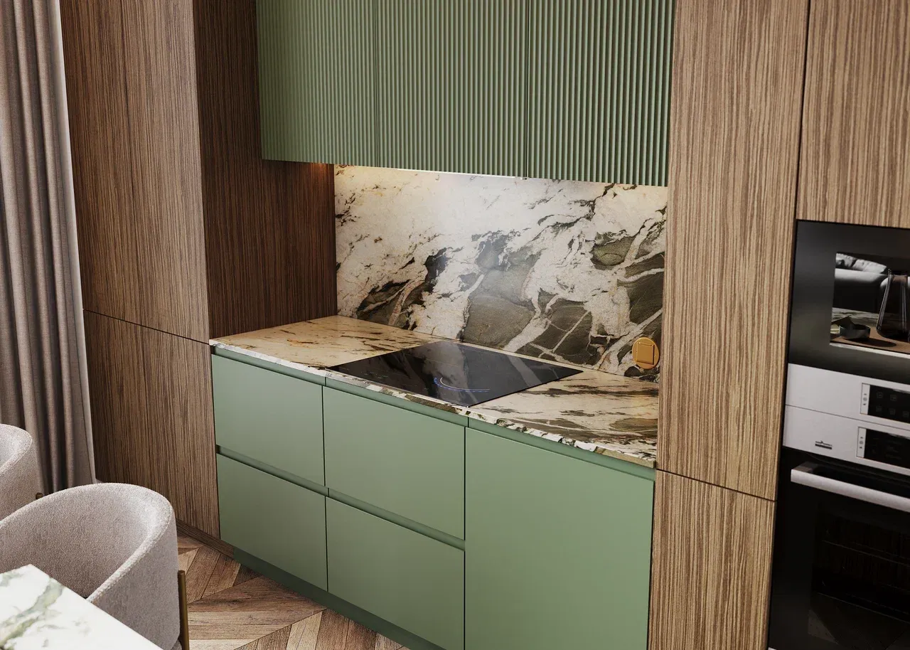 Кухня в стиле модерн с матовым типом покрытия и кварцитовой столешницей — лаконичный ширм и природная эстетика. Четкие линии, приглушенная глубина камня и тактильная мягкость матовой поверхности создают атмосферу утонченного современного уюта. Идеальный баланс функциональности и изысканности.