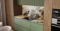 Фасады из МДФ в комбинации 1018S Орех Тайгер и эмали по NCS — гармония природы и современной эстетики. Благородная текстура древесины в дуэте с гладкой эмалевой поверхностью создают эффектный контраст.