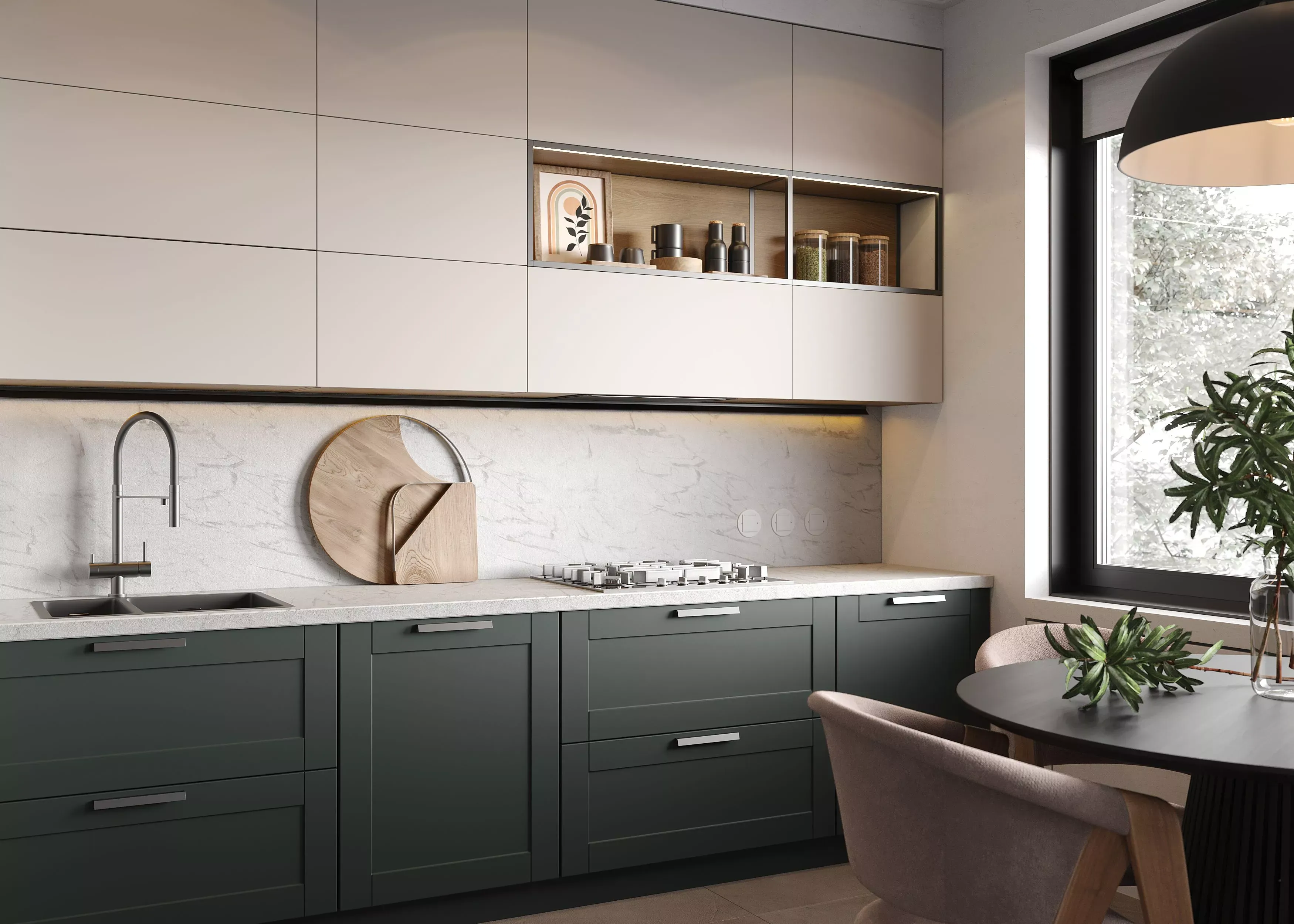 Серо-бежевая кухня в современном стиле подойдет как для отдельной кухни, так и для студии, загородного дома или квартиры в стиле лофт. Благодаря комбинированной окраске гарнитур органично сочетается с отделкой и в темной, и светлой гамме, а фасады двух видом, с рамками и без, оживляют ее и придают своеобразие. Дизайн модели универсален, она одинаково удачно впишется в интерьер, выполненный в стиле сканди, минимализм или лофт.