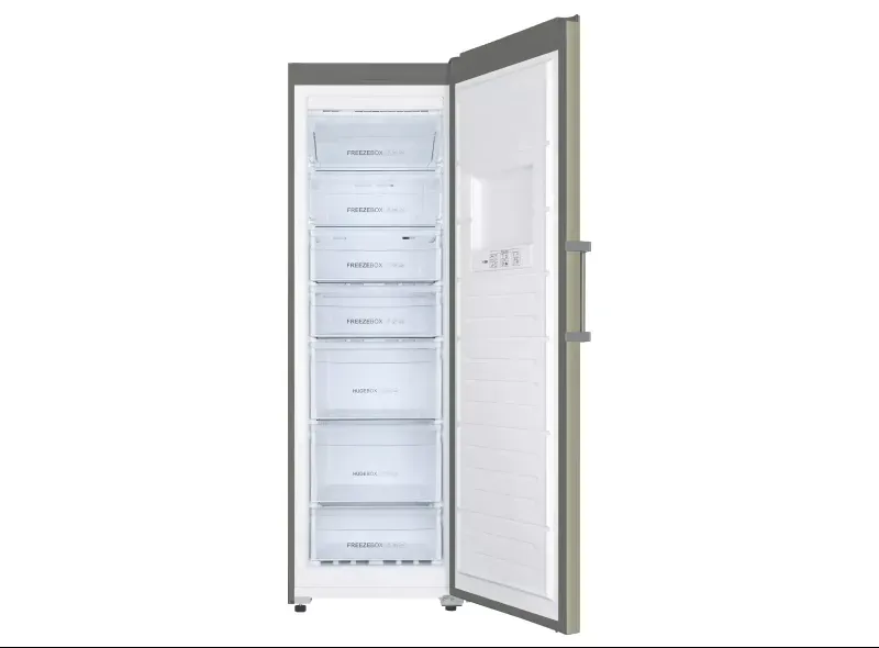 Морозильная камера с функцией Total No Frost - убережет продукты от инея и наледи, а владельца — от ручного размораживания морозилки. Камера высотой 186,5см вмещает полезный объем до 262 л, на двери предусмотрен информативный LED-дисплей с возможностью регулировки температуры. Внутри морозильной камеры предусмотрены 5 боксов разного объема и две полки с крышками наверху. В двери находится разъем для хранения пиццы. Для удобства использования в морозильной камере предусмотрено верхнее LED-освещение. Цвет камеры - золотой, дверная ручка перенавешивается.