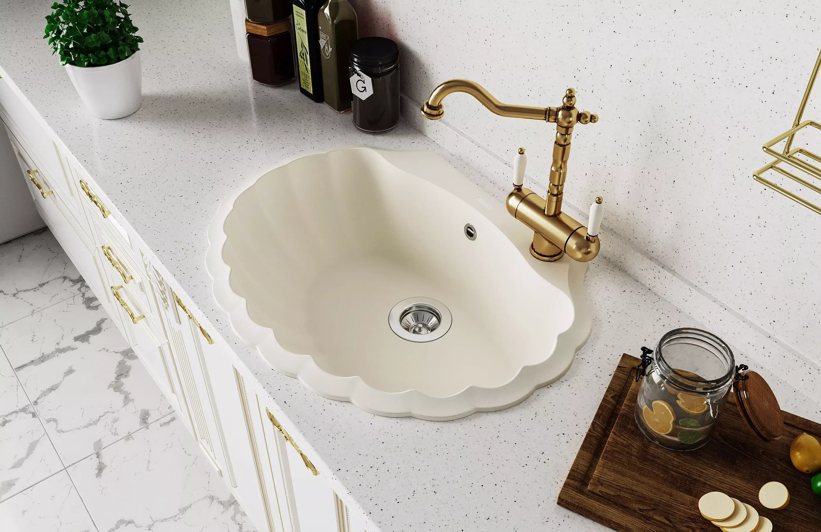 Необычная кухонная мойка, напоминающая форму раковины. Придаст неповторимость и настроение вашей кухне. Дополнительные отверстия для установки аксессуаров.
