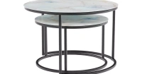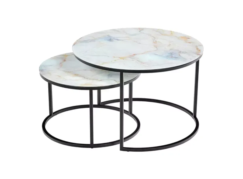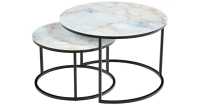 Элегантная пара кофейных столиков Tango станет изящным дополнением любой гостинной или даже спальни. Рисунок на столешнице, выполенной из стекла с имитацией натурального камня, завораживает и притягивает взгляд. Столики можно расположить парой или расставить по отдельности. Чёрные ножки позволят вписать этот набор в любой интерьер. Размер большого столика: диаметр - 60х41см. Размер маленького столика: диаметр - 47,5х31см.