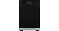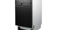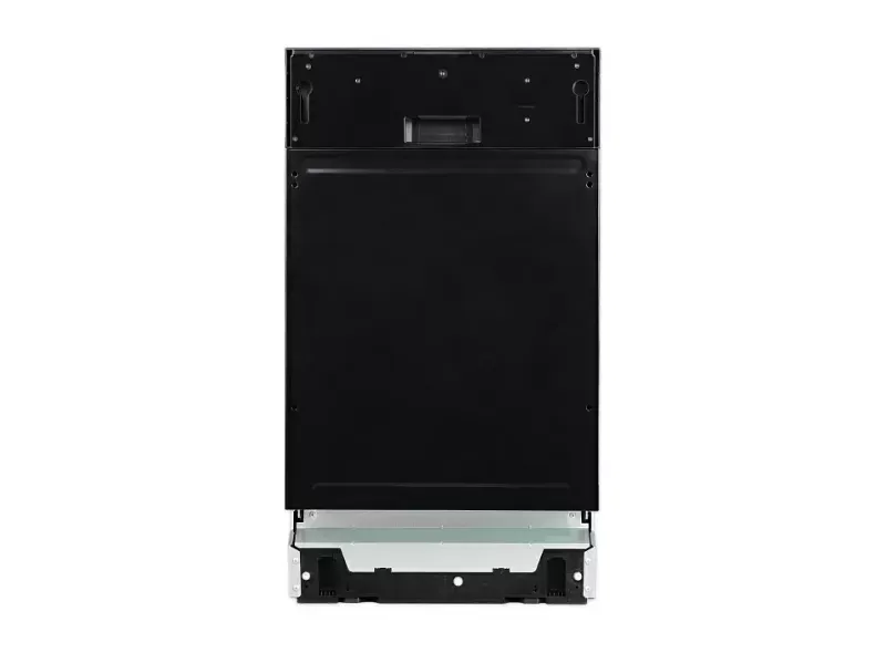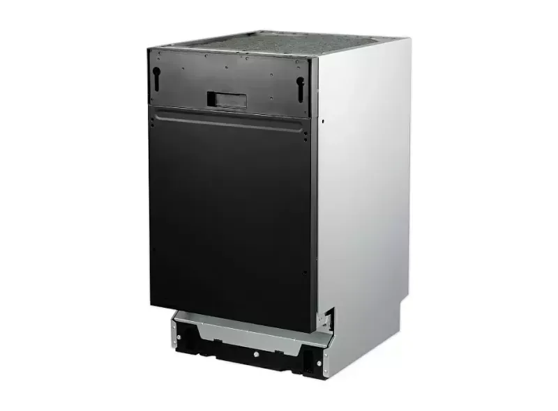 Встраиваемая узкая посудомоечная машина шириной 45 см с черным цветом фронтальной панели.
