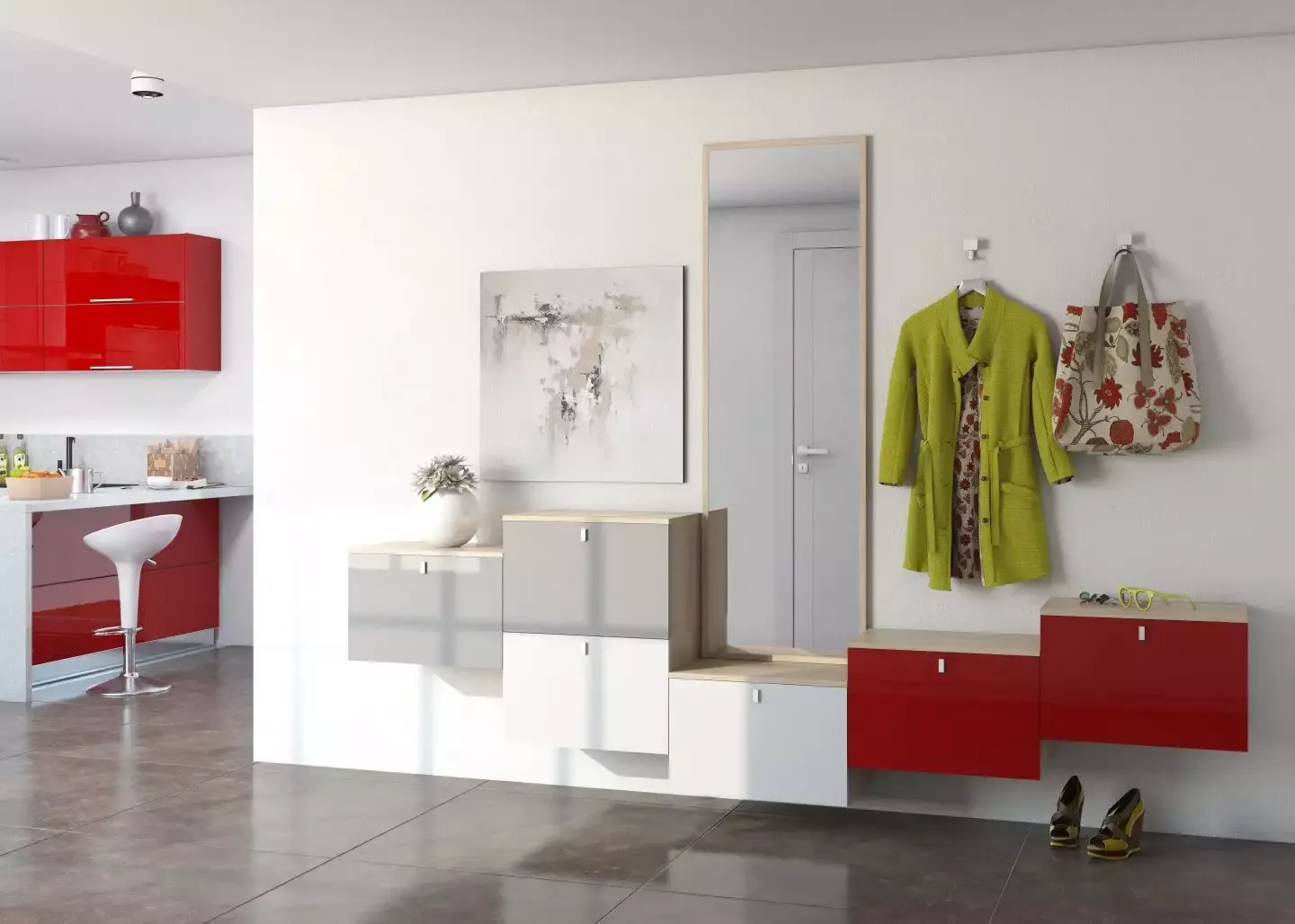 Мебельный комплект представляет собой несколько подвесных модулей, установленных в хаотичном порядке. Варианты фасадов могут быть самые различные: выдвижной ящик, распашной фасад или откидной вверх/вниз. Пара крючков и зеркало завершают картинку.
