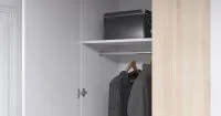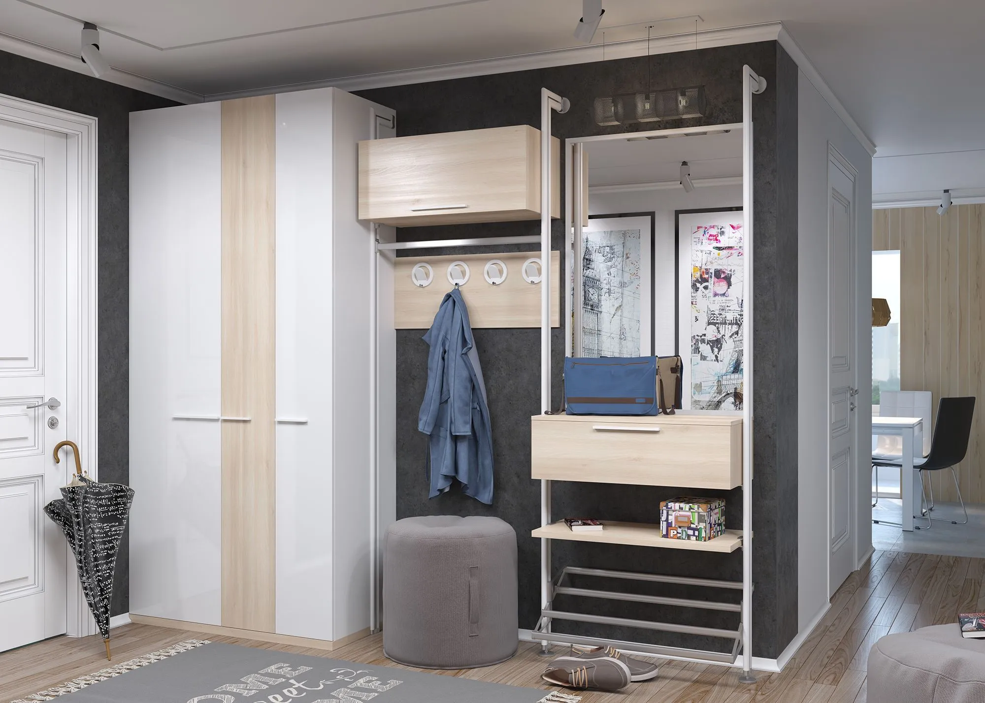Прихожая (арт. 070) отличается необычным дизайном и интересными решениями. Она спроектирована как молодёжный вариант для квартир-студий и помещений в стиле лофт, отсюда внимание к деталям и текстурам, нарочитая грубость стоек.