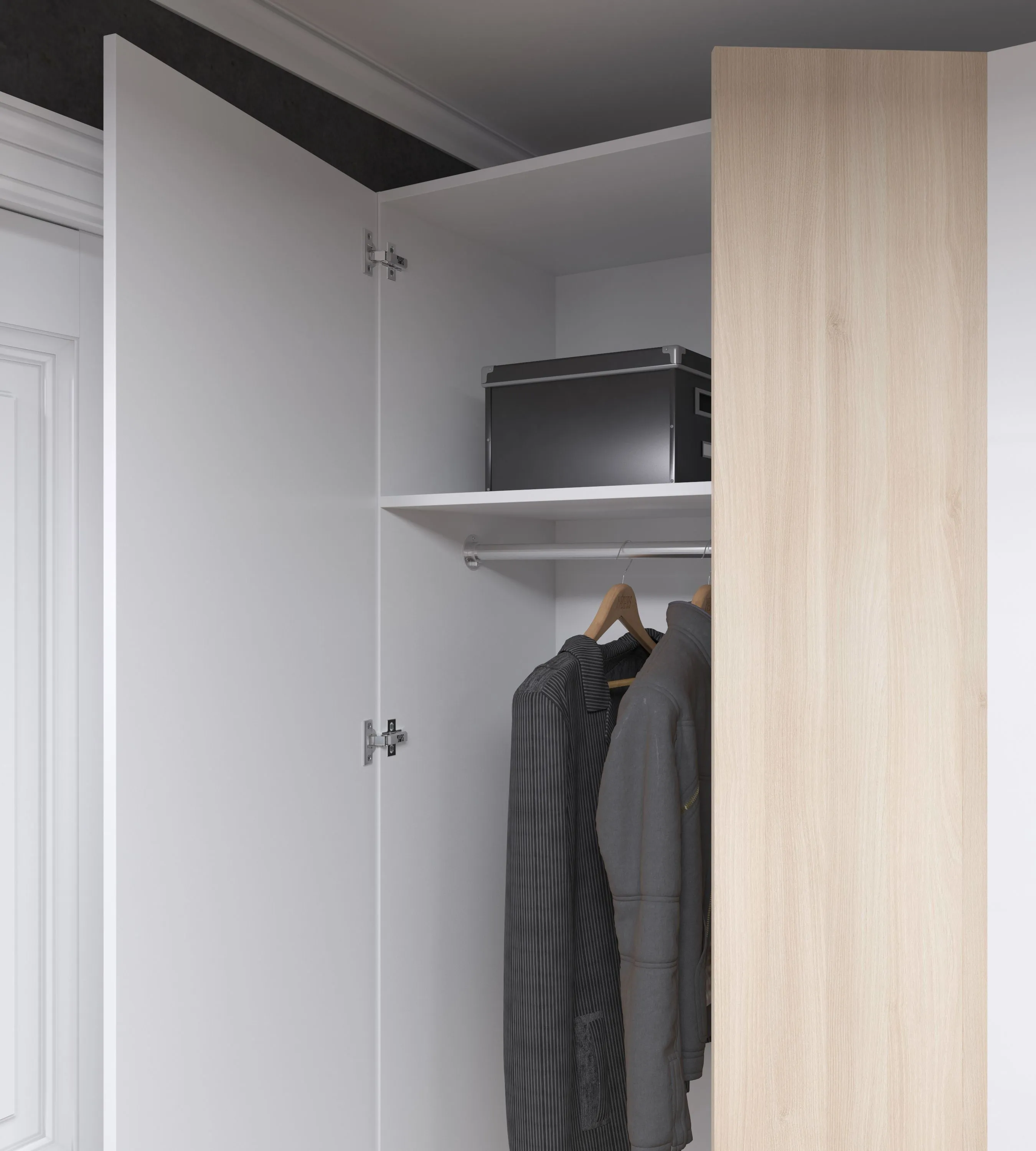 Основные цвета гарнитура — белые матовые фасады шкафа и светлые ламинированные элементы «Акация».