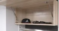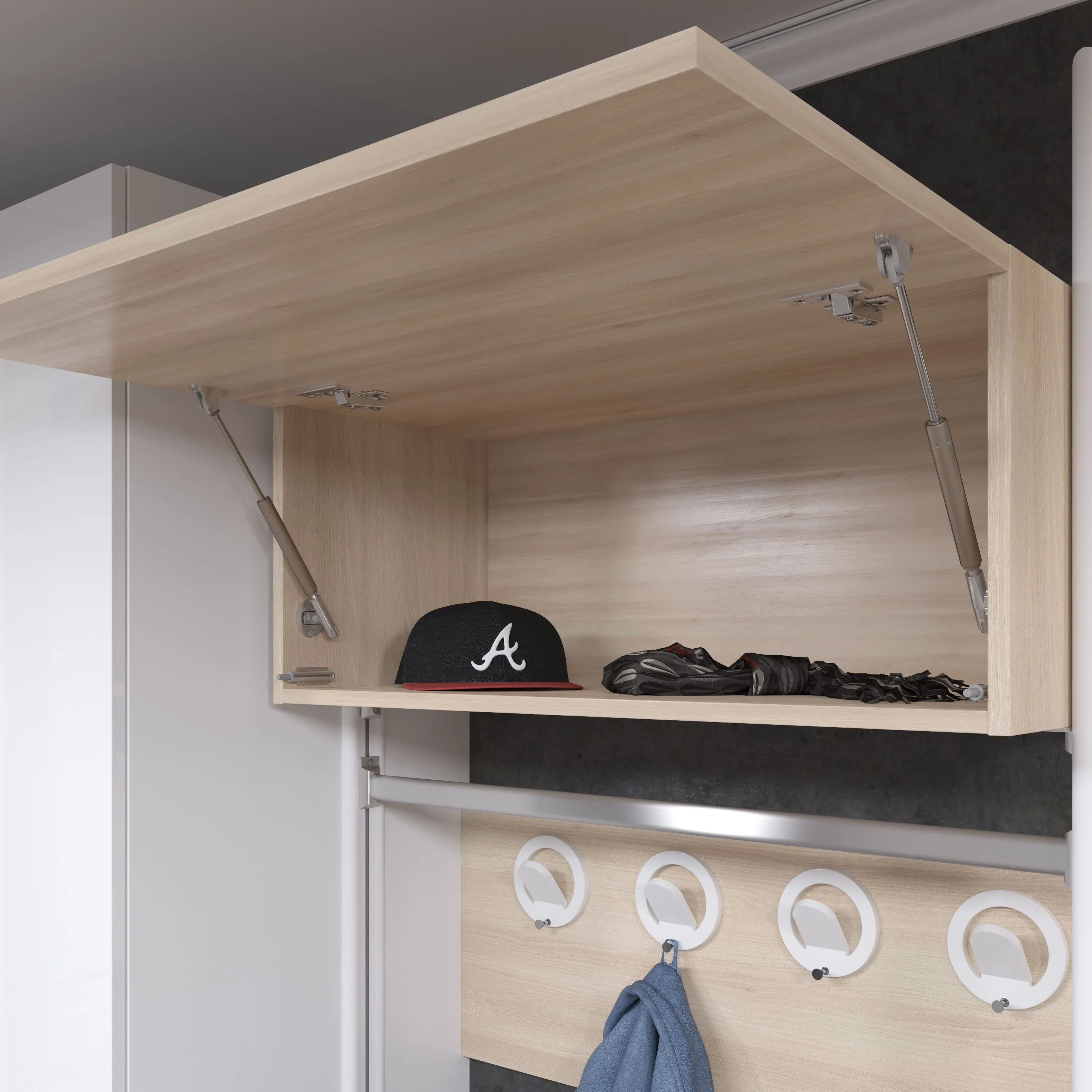 Основа стеллажа — стойки «Лофт 24». Внизу расположена решётка-обувница, полка для аксессуаров и перчаток, а также закрытое отделение для головных уборов. На стеновой панели имеются практичные крючки «Джиаро». Над зеркалом «Jump 20» установлен светильник.