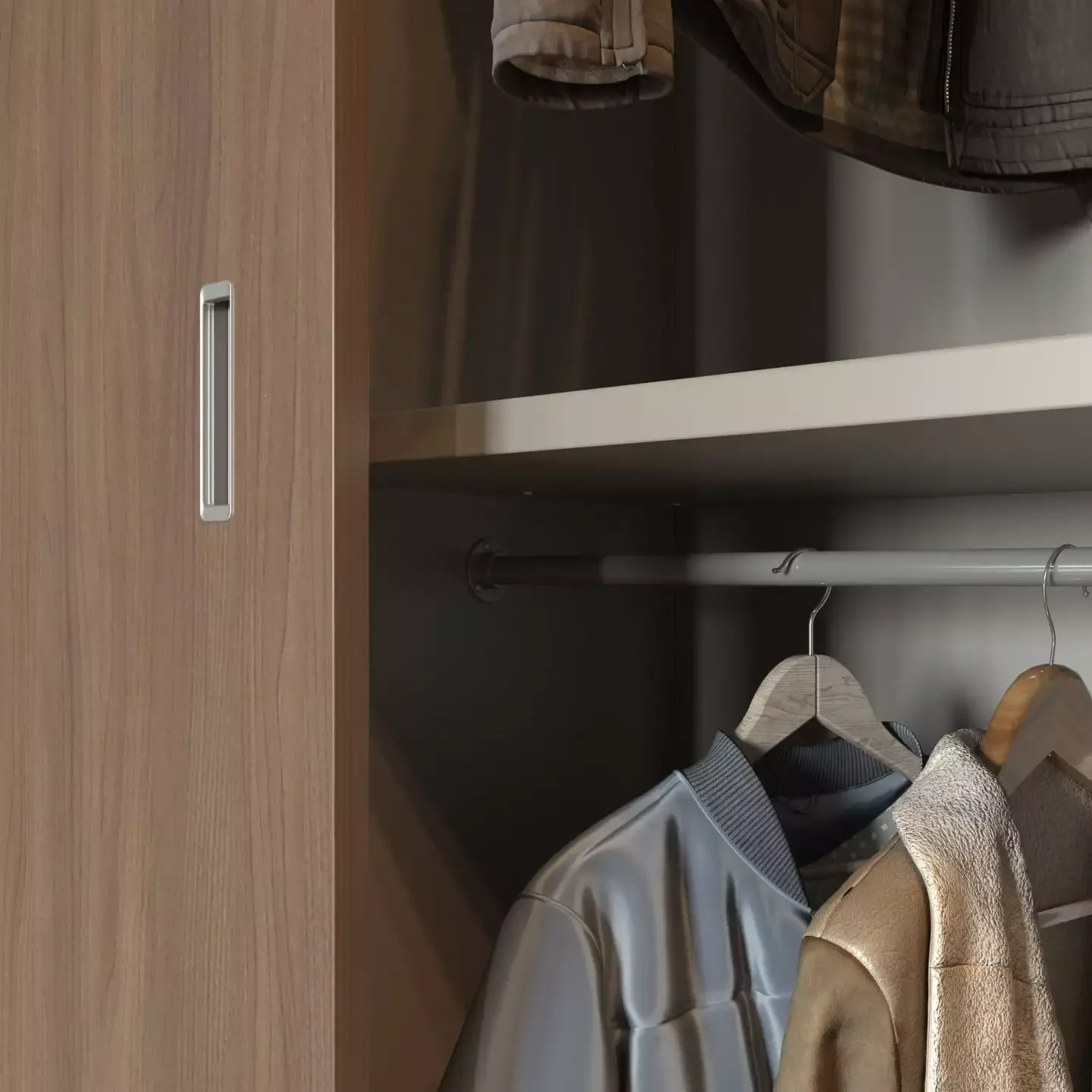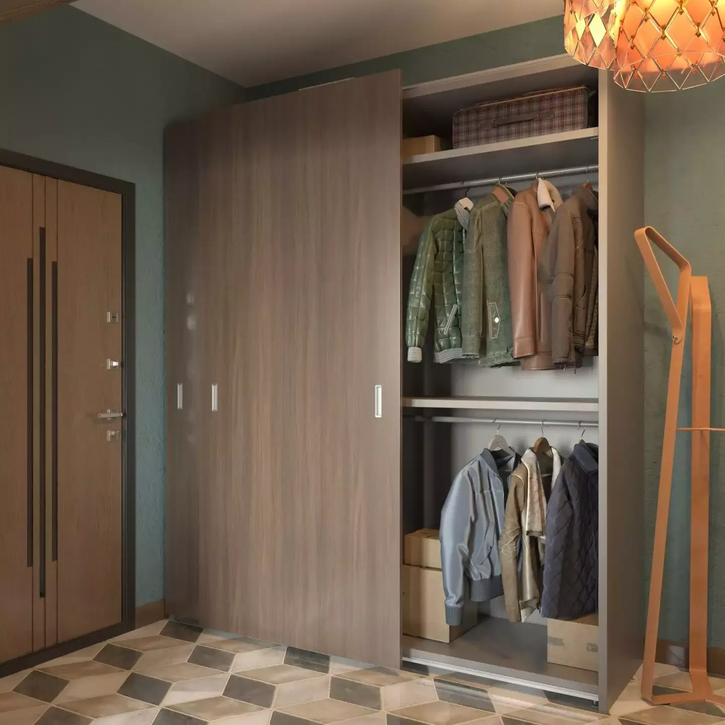Внутри – полки, вешала для одежды, обувница «Хромос».