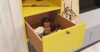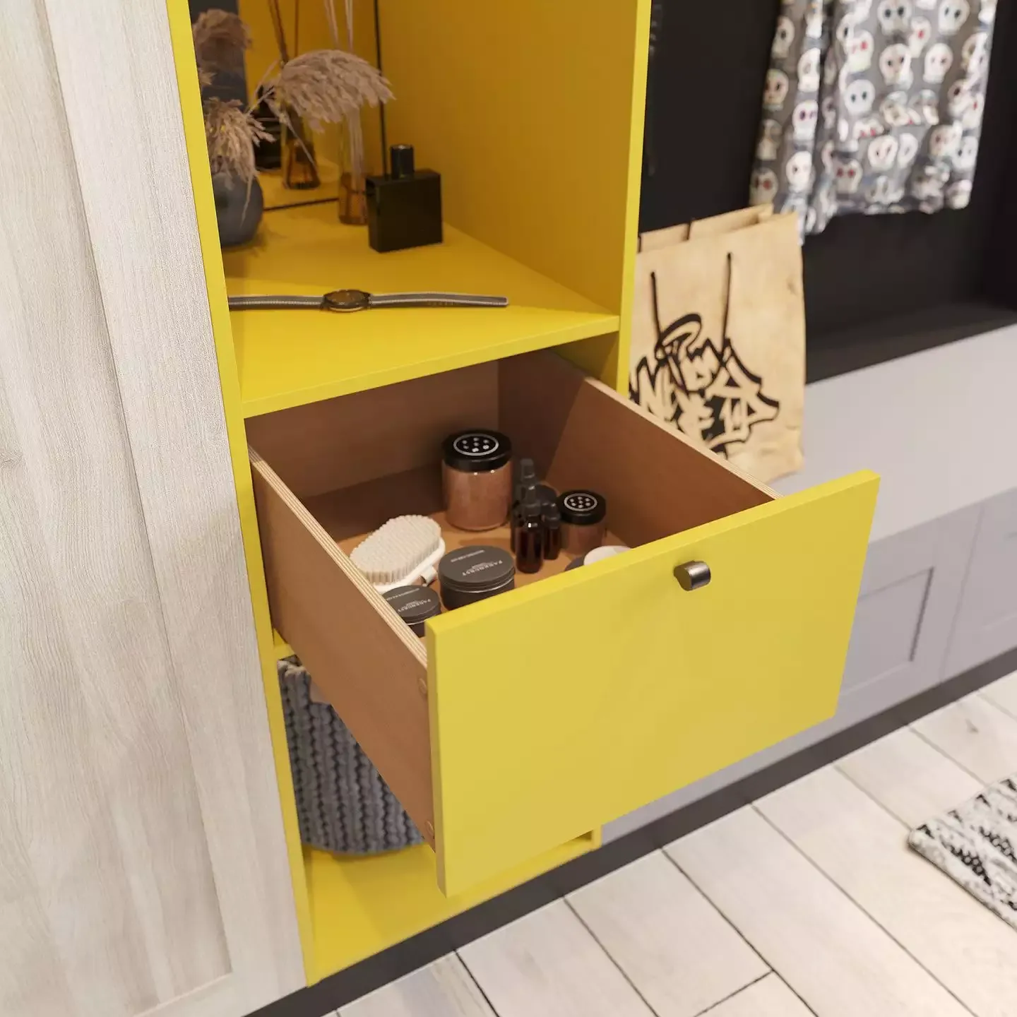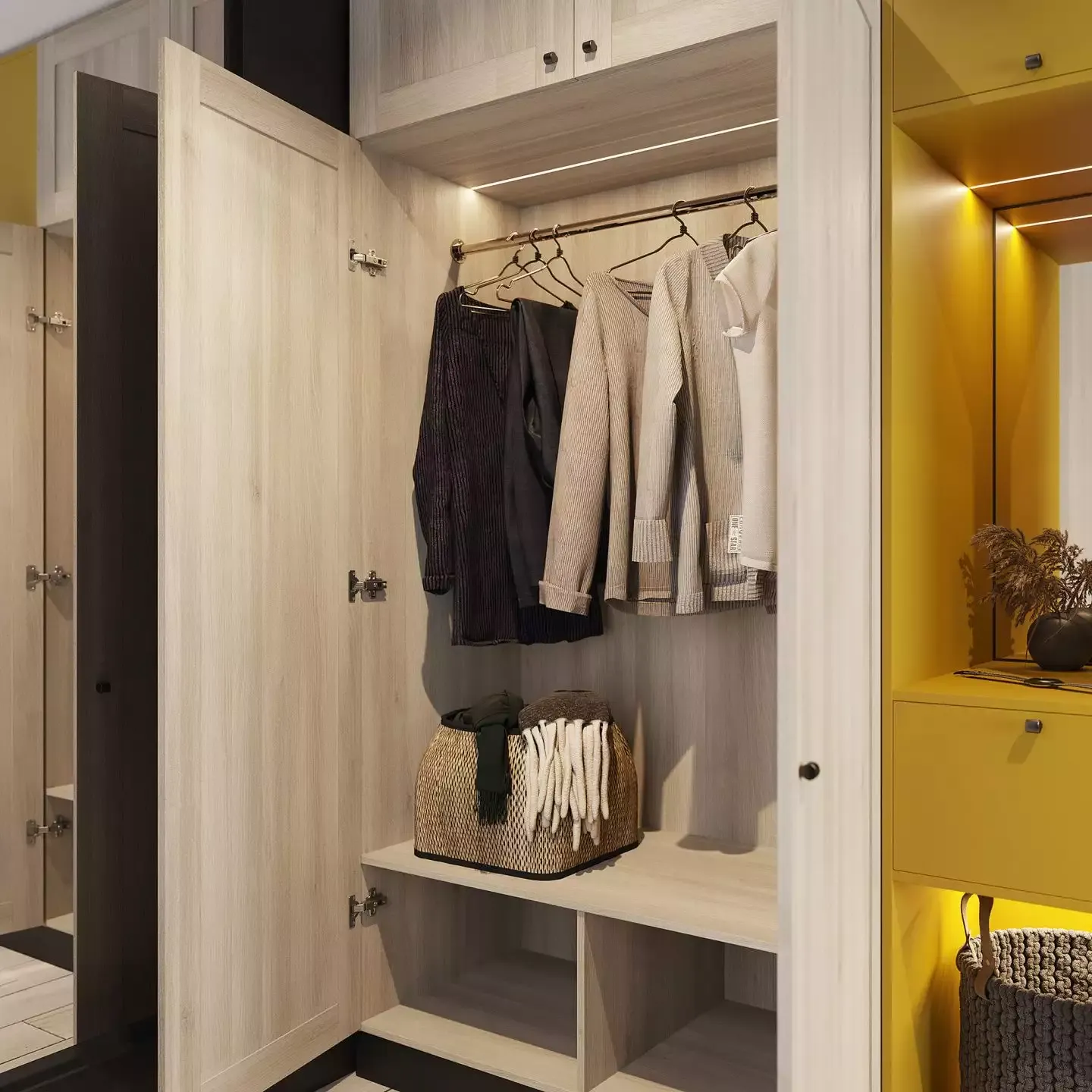 Корпус прихожей изготовлен из ламинированной плиты в декорах “Гейнсборо” и “Акация” с имитацией текстуры дерева. Панель открытой вешалки с крючками выполнена в декоре “Ситивуд черный”. Яркие желтые цвета пенала - Эмаль RAL (1023). На всех фасадах установлены небольшие изящные ручки “Колибри”. Внутреннее наполнение, внешние параметры и декоративные элементы — все это создается по индивидуальному проекту для каждого заказчика.