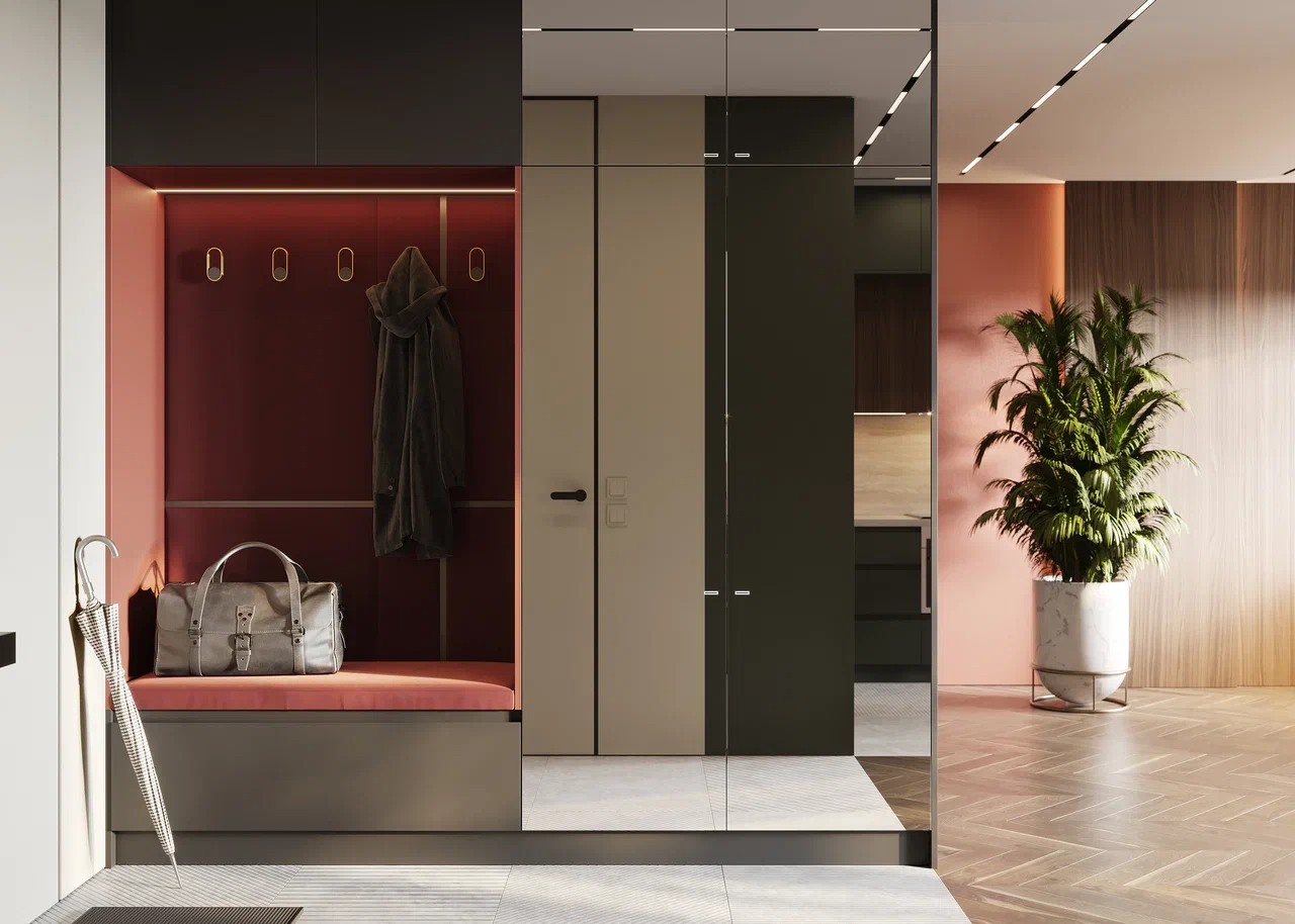 Прихожая Домус впечатляет стильным дизайном: распашной шкаф с зеркальными дверями, создает ощущение воздушности и простора. Мягкая стеновая панель с сидушкой из ткани “Фантазия42” и вставками из золотистого металла создают изысканный и уютный интерьер. Золотистые акценты придают панели роскошный вид, а комфортная обивка приглашает к отдыху, идеально сочетая стиль и функциональность.