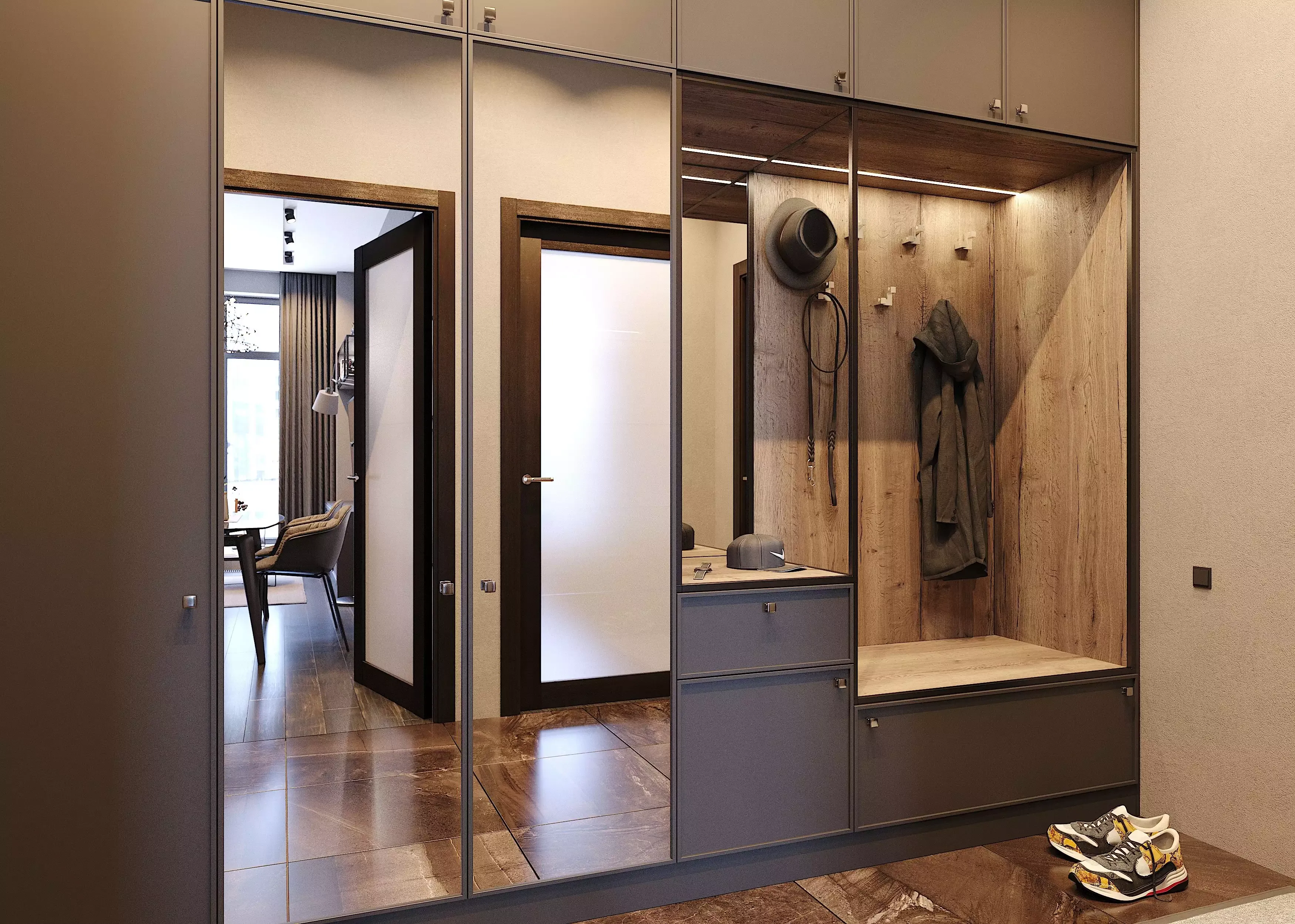 3. зону вешалки с ящиками и зеркалом.