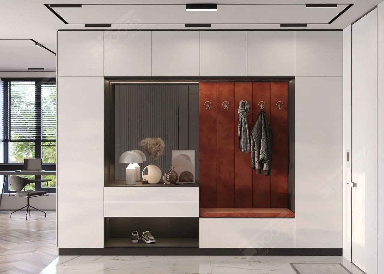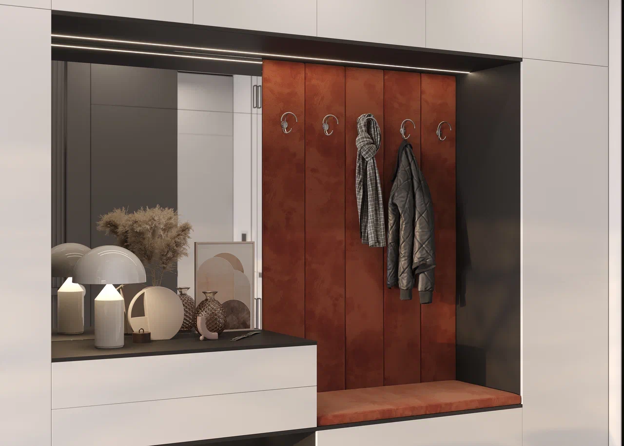 Светлая прихожая с распашными дверями и небольшим удобным зеркалом сочетает в себе множество преимуществ, создавая уютное и функциональное пространство. Светлые оттенки визуально расширяют помещение, делая его более просторным и легким, а распашные двери обеспечивают удобный доступ и могут легко вписаться в любой стиль интерьера, добавляя упорядоченности и организованности.