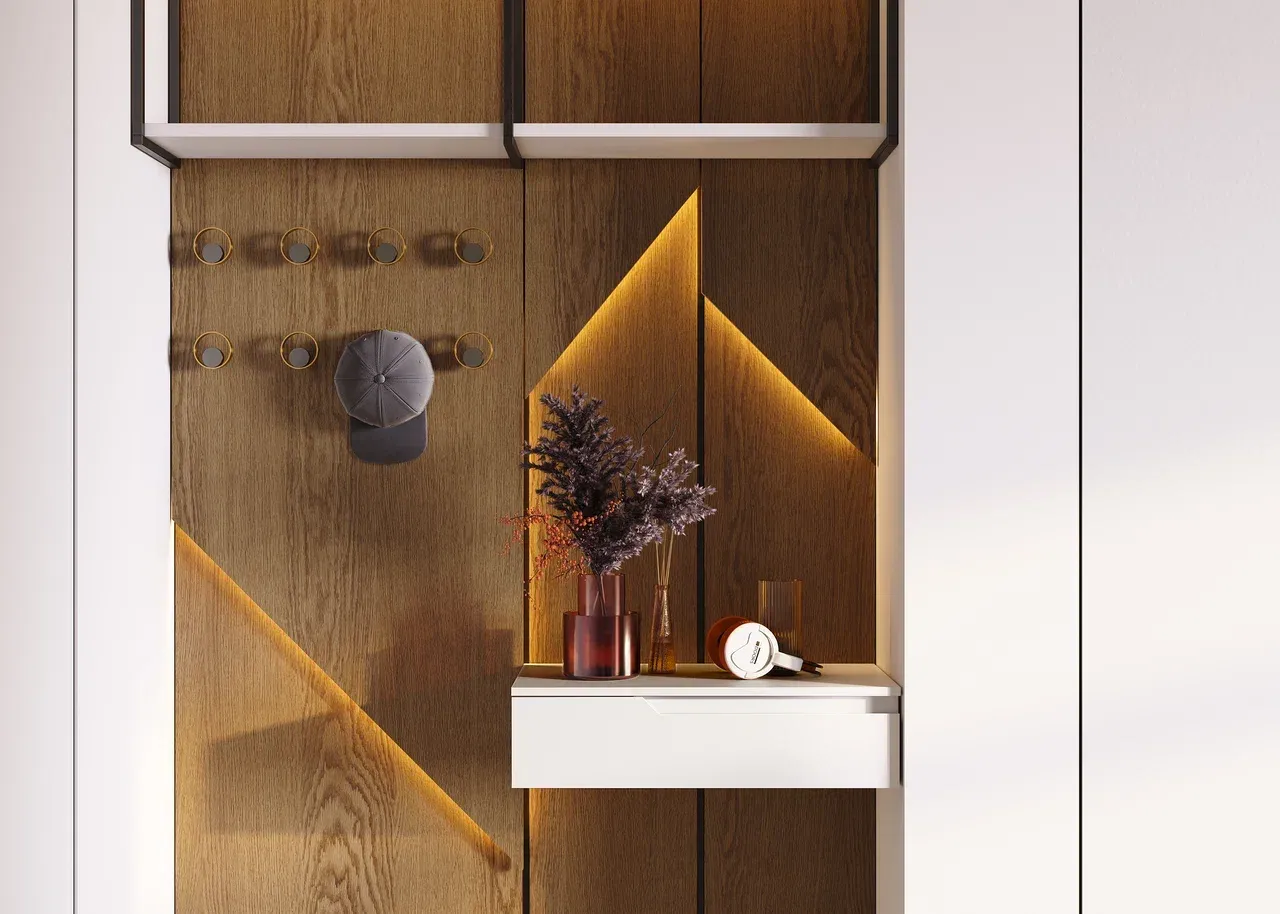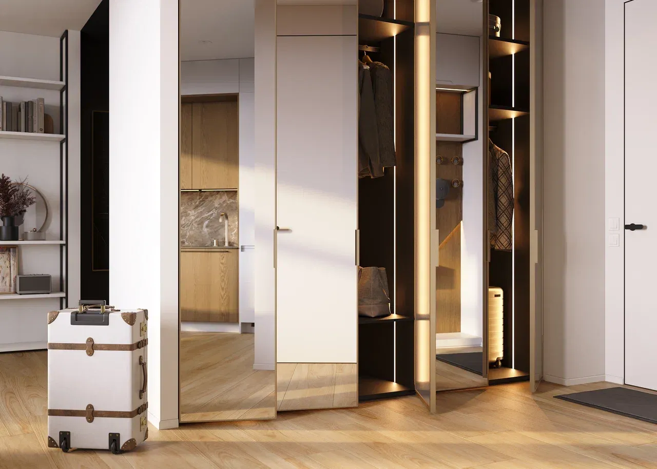 Прихожая в стиле модерн с распашным шкафом и зеркальным типом покрытия – это стильное и функциональное решение. Зеркальные дверцы визуально расширяют пространство и помогают контролировать внешний вид перед выходом из дома.
