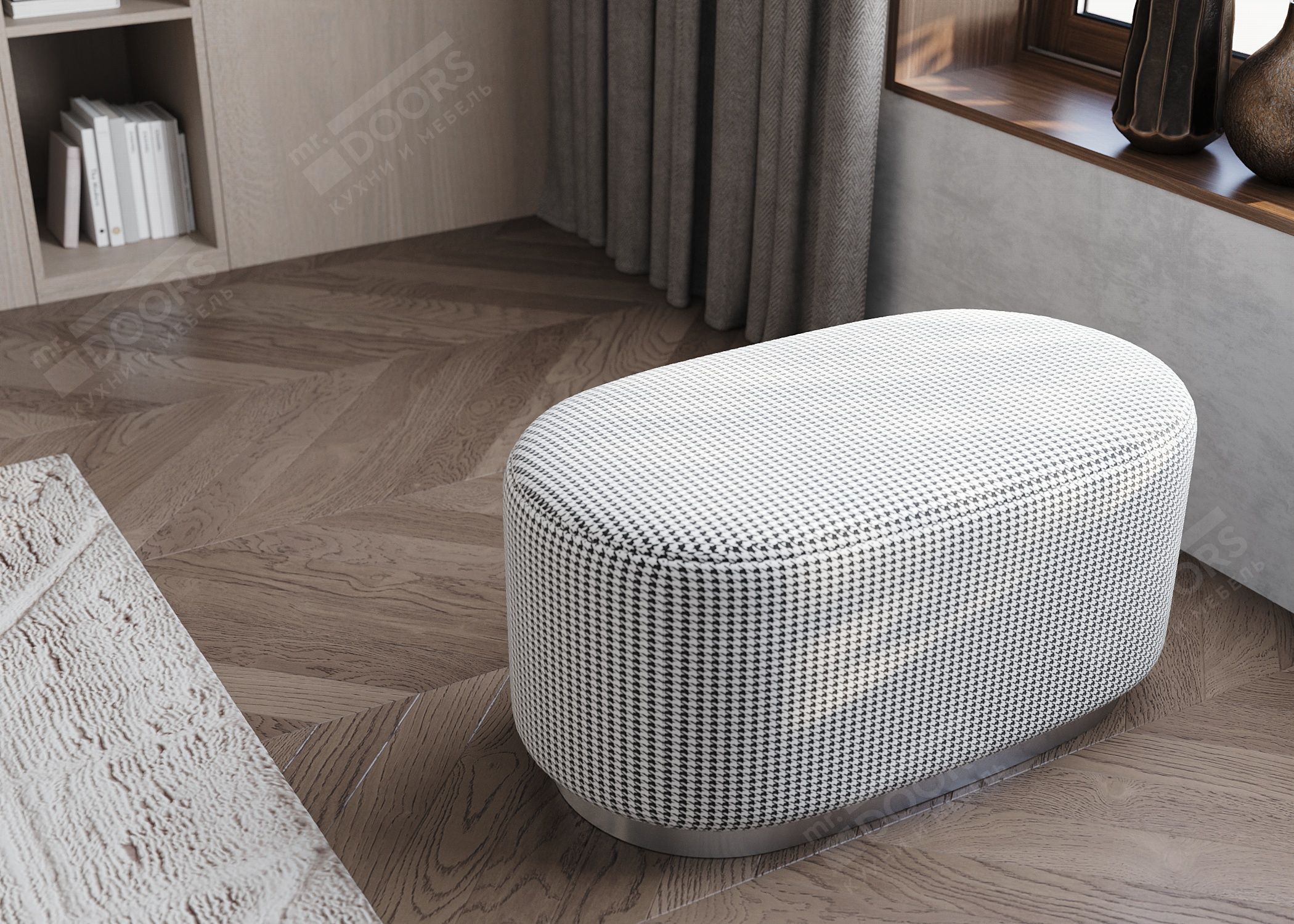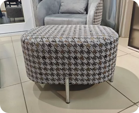 Овальный пуф на декоративном основании выполнен из качественных материалов и включает следующие элементы конструкции: