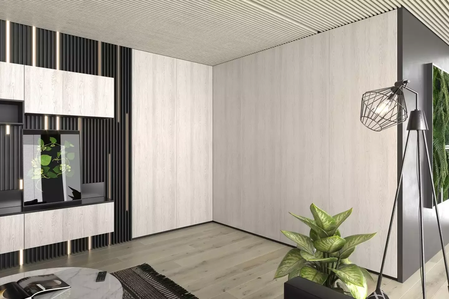 Корпус выполнен из ламинированной плиты чёрного цвета, а фасады — из структурированной плиты «Ясень Севилья». Материал с точностью имитирует поверхность натурального дерева, её неоднородность и рисунок — кажется, что распашной шкаф сделан из массива.