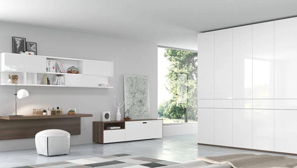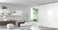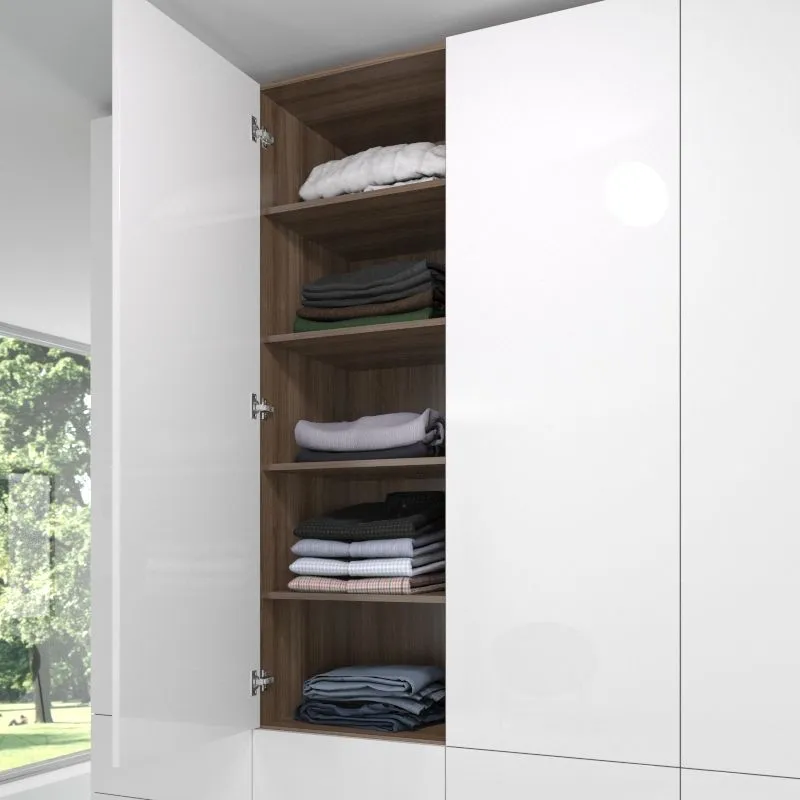 Большой глянцевый шкаф белого цвета. Распашные фасады платяного шкафа (отделка белой высокоглянцевой эмалью) разделены рядом выдвижных ящиков, которые расположены на максимально удобной для использования высоте. Шкаф предназначен для установки в гостиной или спальне. В зависимости от расположения вы можете выбрать внутреннее оснащение.