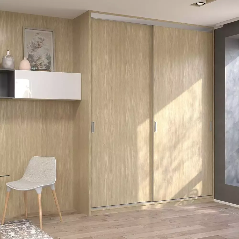 В базовой компоновке глубина модели — 650 мм, высота — 2400, ширина — 1500 мм, так что изделие в типовой квартире достигает потолка. Габариты шкафа вымеряются индивидуально для каждого клиента. Корпус изготавливается из ДСП толщиной 16 мм в декоре «Акация», раздвижные полноформатные двери — профиль «Лайт-А» в декоре «Матовое серебро» с зеркальными и ДСП-вставками.