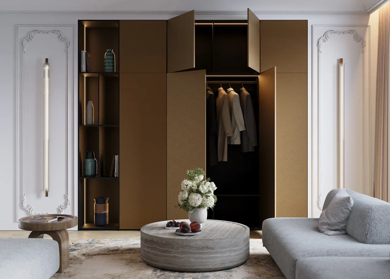 Распашной шкаф в стиле неоклассика. Идеальный баланс классической элегантности и современных линий. Роскошная фурнитура и сдержанный декор создают в интерьере атмосферу утонченного благородства и гармонии