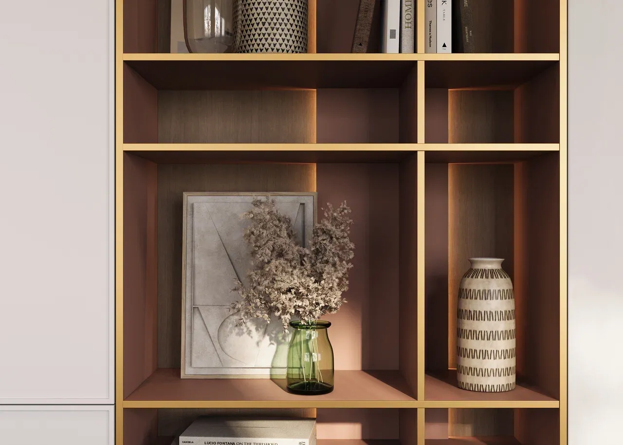 Несколько полок, расположенных вертикально в шкафу, создают стильное и функциональное решение для хранения различных предметов интерьера. На таких полках можно разместить книги, вазы, декоративные элементы и другие аксессуары, добавляя комнате индивидуальности и уюта.