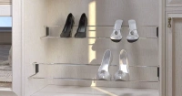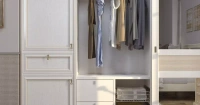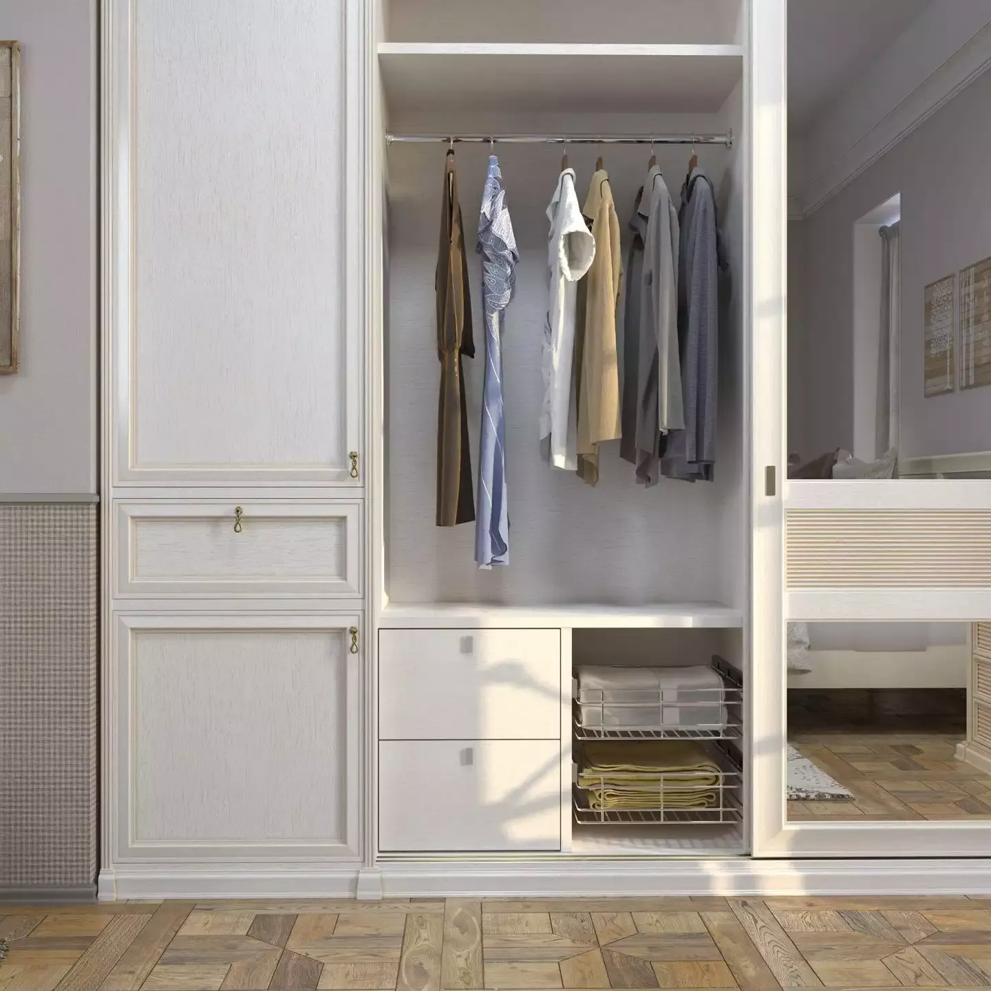 Каркас из ЛДСП разделен на центральное отделение, закрытое дверями-купе — оно предназначено под размещение одежды на вешалах, обуви, белья в выдвижных корзинах и ящиках — и распашными дверями в крайних секциях с полками для сложенной одежды. Выдвижные ящики снабжены механизмом полного выдвижения и доводкой.