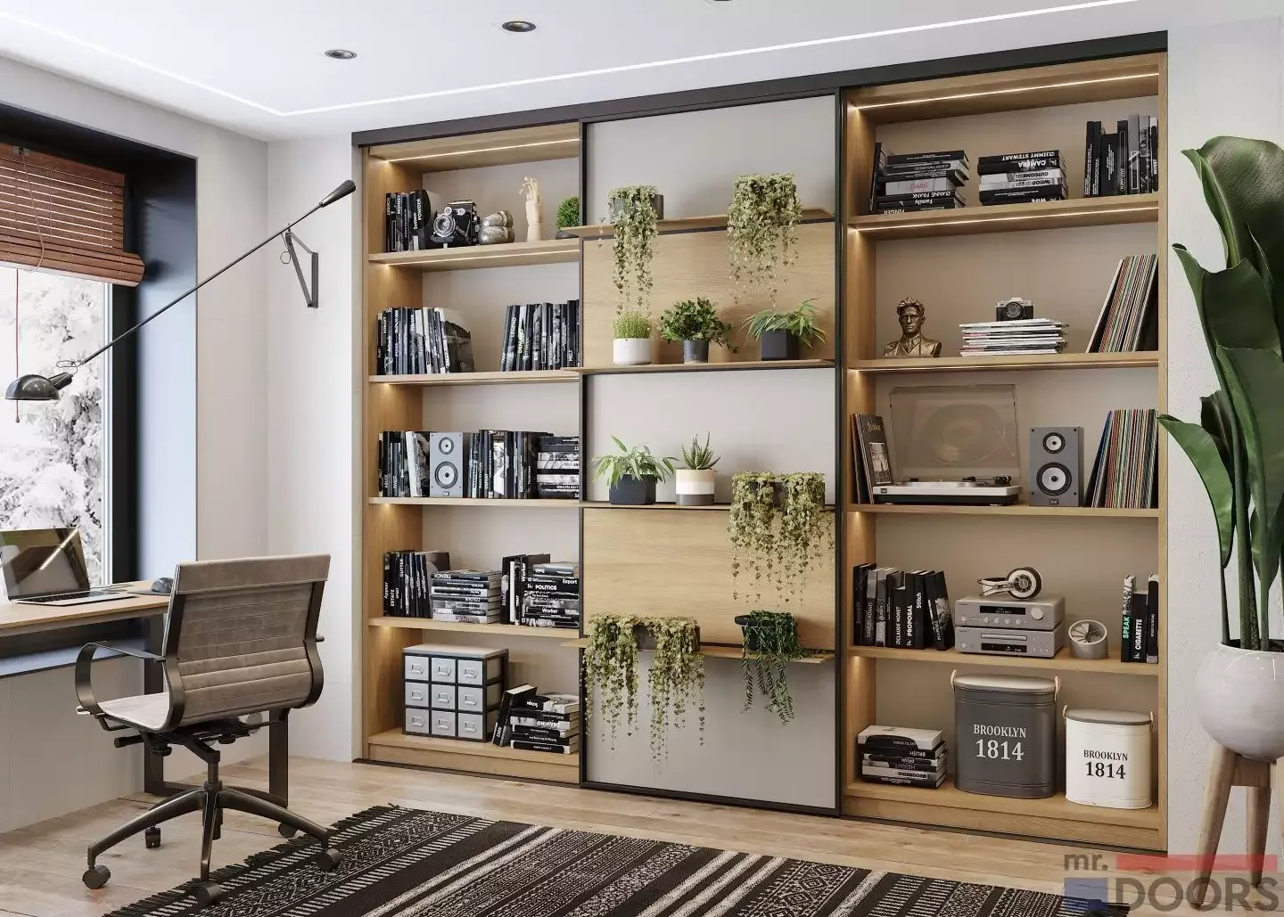 Понравился этот эффектный стеллаж, видите его в своей комнате? Приходите в Ателье мебели Mr.Doors и мы создадим этот проект в вашем помещении с учетом всех размеров и предпочтений. Мы используем только уникальные решения, качественные материалы и лучшую фурнитуру. Ждем вас! Или просто вызовите замерщика по телефону!