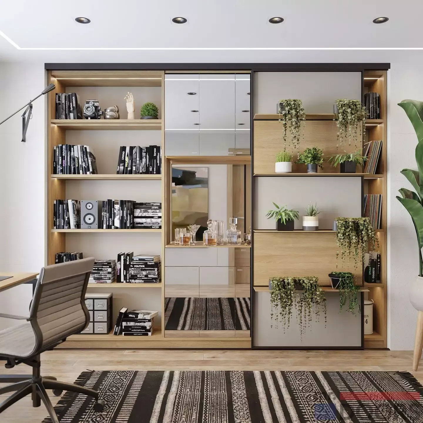 Стеллаж в кабинет или гостиную с раздвижной дверью. С лицевой стороны в дверь встроены открытые полки, на которых можно разместить комнатные цветы или памятные вещи, фотографии. За фасадом находится бар с зеркальными фасадами «Skin».