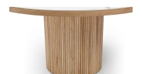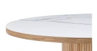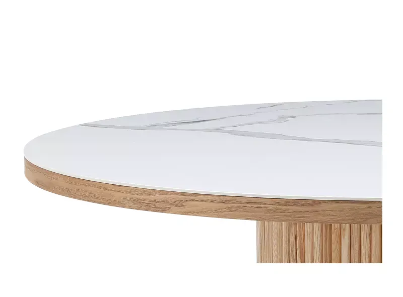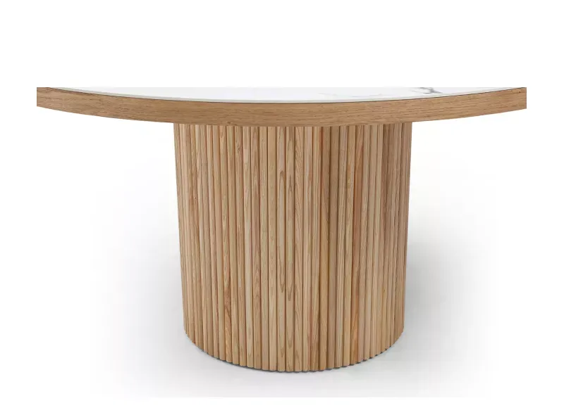 Столешница сделана из MDF с керамическим покрытием толщиной 6 мм и в шпоне ясеня по краю. Ножка стола также декорирована ясенем. Диаметр столешницы составляет 150 см, круглая форма обеспечивает дополнительное удобство: большую вместимость, чем аналогичные квадратные модели, а также отсутствие углов, о которые можно удариться. За столом диаметром 150 см комфортно размещаются 8 человек.