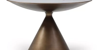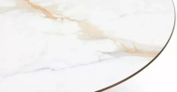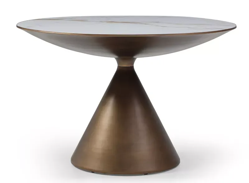 Круглая столешница из керамики толщиной 6 мм, диаметр 120 см. Подстолье сделано из металла в бронзовом оттенке с патиной.