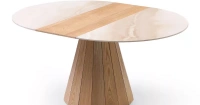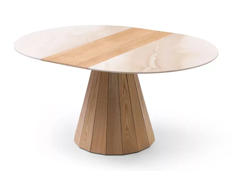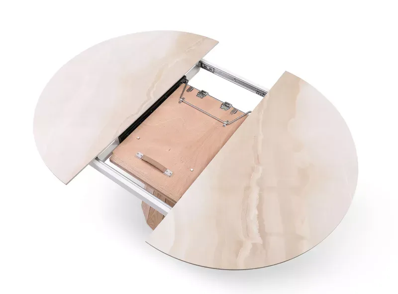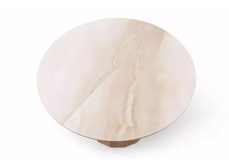 Круглый стол Eterna с керамической столешницей диаметром 120 см раскладывается в овальный. Столешница изготовлена из керамики толщиной 12 мм, центральная вставка и ножка – из MDF и шпона ясеня.