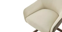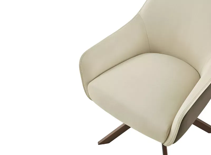 Стул Emma имеет высокую спинку, на которую можно с комфортом облокотиться, и удобные подлокотники. Его обивка из велюра представляет комбинацию бежевого цвета с внутренней стороны и коричневого со стороны спинки. Ножки из металла покрыты защитным напылением бронзового оттенка.