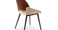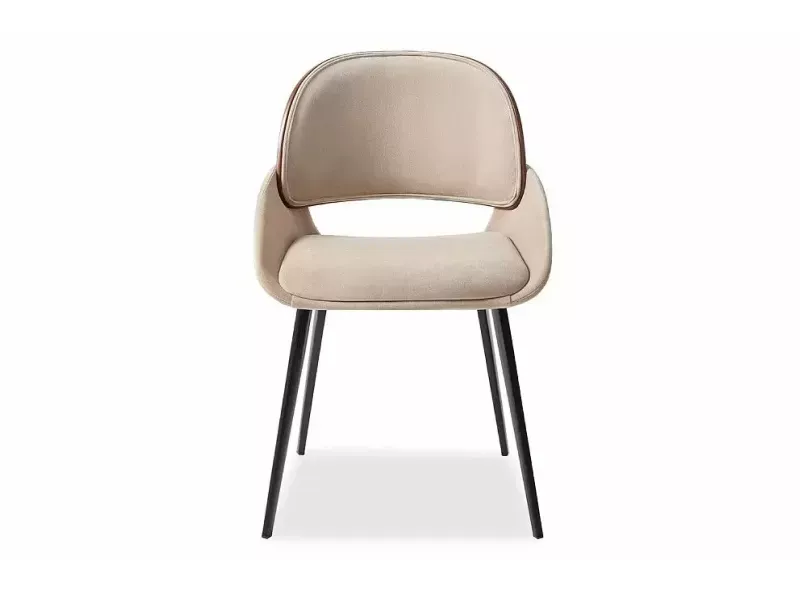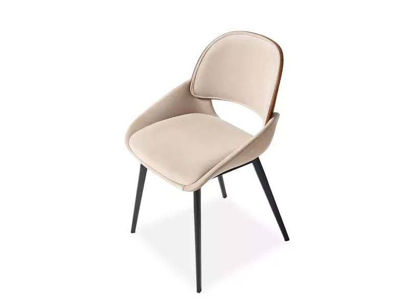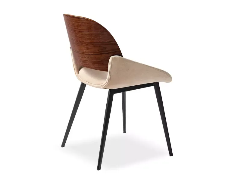 Стулья Jerry отличаются своим дизайном, гармонично сочетающим несколько разных фактур. Спинка из гнутой многослойной фанеры, отделка в шпоне ореха в комбинации с мягкой обивкой из велюра. Черные ножки из металла.