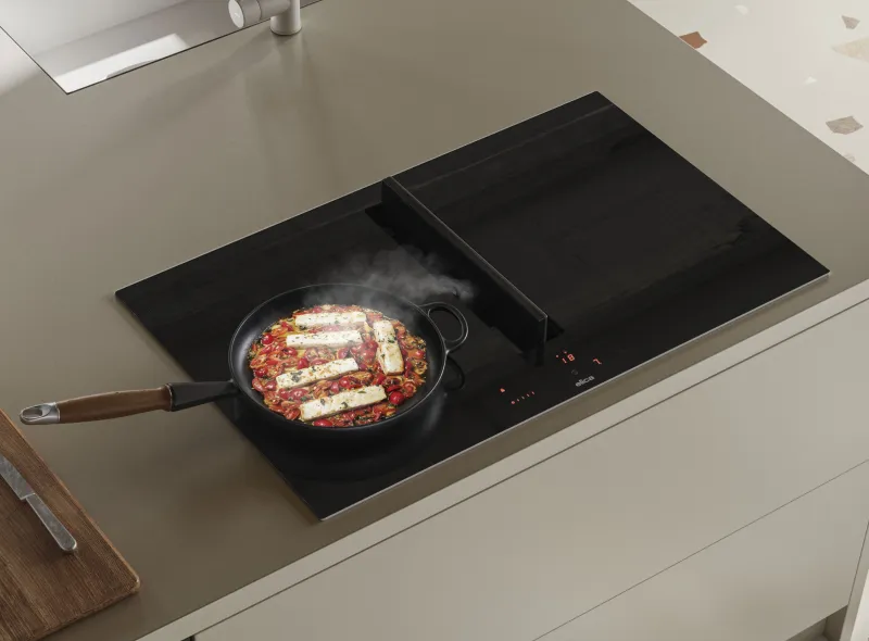 Варочные панели с вытяжкой подходят как для больших, так и для более компактных кухонь. Их изысканная текстура скрывает мощную систему аспирации воздуха, которая активируется простым движением центральной заслонки.