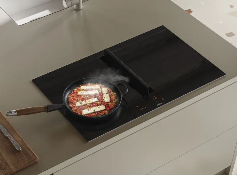 Варочные панели с вытяжкой подходят как для больших, так и для более компактных кухонь. Их изысканная текстура скрывает мощную систему аспирации воздуха, которая активируется простым движением центральной заслонки.